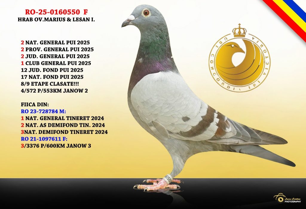 Vicecampioana națională avea deja patru pene schimbate la începutul sezonului și a reușit să claseze trei etape într-o săptămână: viteză, demifond și fond. Spre final și-a pierdut din motivație, astfel că am împerecheat-o cu un mascul matur, decizie care a adus un nou impuls de formă și o clasare foarte bună la următorul fond. Este reprodusă din campionul național al lui Cosmin Leonteș la General Tineret 2024, vicecampion național la As Demifond Tineret și locul 3 Național General Tineret, combinat cu o femelă din propria noastră linie de zburători”, a explicat Ovidiu Hrab.