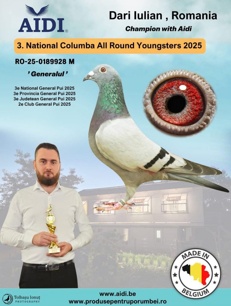 Podiumul național este completat de Iulian Dari, din Horodnicul de Sus, cu porumbelul RO-2025-0189928, care a obținut locul 3 Național la categoria General Pui cu 458,69 puncte de penalizare. Columbofilul a abordat sezonul strategic, împărțind lotul de 130 de pui în două echipe. Prima echipă a fost ținută la program de întuneric și angajată la toate tipurile de etape, inclusiv fond și maraton. A doua echipă a concurat la natural și a fost angajată doar la etapele de viteză. Strategia a funcționat aproape perfect, iar rezultatul a venit „in extremis”, prin acest pui care a clasat în doar două săptămâni o etapă de viteză, una de fond și două de demifond – încheind norma cu ultima etapă de demifond.