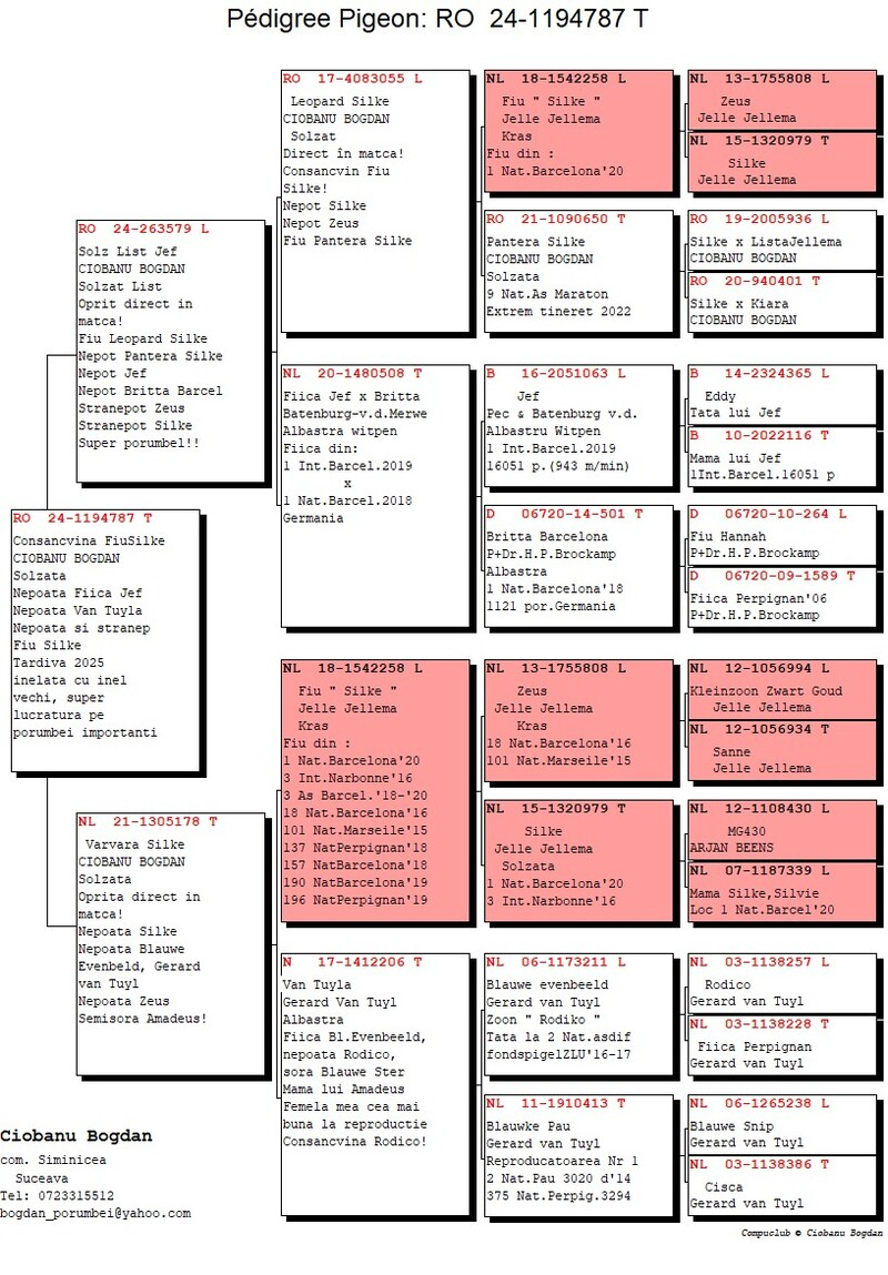 Seine nachgewiesenen Erfolge zeugen von einer professionellen und konsequenten Herangehensweise. Im Laufe der Jahre erreichte der Züchter aus Siminicea mehrfache Platzierungen in den Top 10 auf nationaler Ebene in den Kategorien Marathon und Fond, belegte den 1. Platz im Kreis Suceava bei Flügen von 800–1000 km und erzielte bemerkenswerte Ergebnisse bei schwierigen internationalen Wettbewerben in der Ukraine und Polen (z. B. Krasnodon). Die regelmäßige Teilnahme am Burdujeni–Suceava-Championat, einer der stärksten Regionen des Landes, bestätigt die Konstanz und Qualität seiner Zuchtlinie.