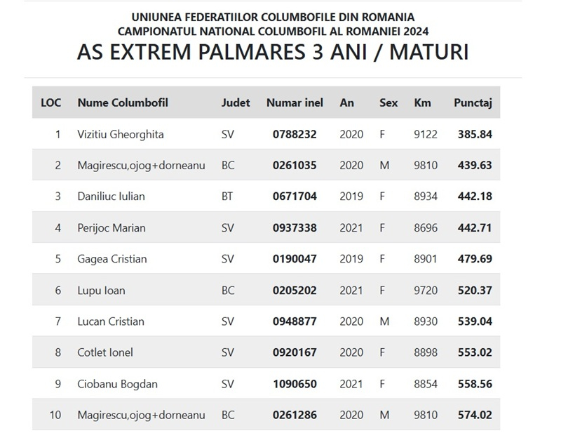 Seine nachgewiesenen Erfolge zeugen von einer professionellen und konsequenten Herangehensweise. Im Laufe der Jahre erreichte der Züchter aus Siminicea mehrfache Platzierungen in den Top 10 auf nationaler Ebene in den Kategorien Marathon und Fond, belegte den 1. Platz im Kreis Suceava bei Flügen von 800–1000 km und erzielte bemerkenswerte Ergebnisse bei schwierigen internationalen Wettbewerben in der Ukraine und Polen (z. B. Krasnodon). Die regelmäßige Teilnahme am Burdujeni–Suceava-Championat, einer der stärksten Regionen des Landes, bestätigt die Konstanz und Qualität seiner Zuchtlinie.