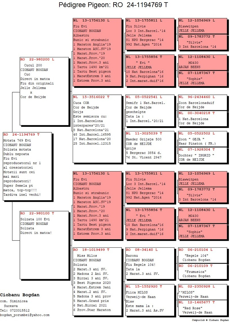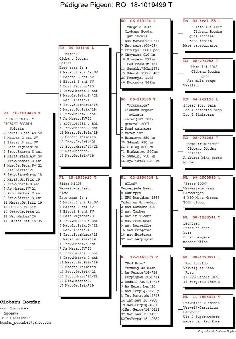 Seine nachgewiesenen Erfolge zeugen von einer professionellen und konsequenten Herangehensweise. Im Laufe der Jahre erreichte der Züchter aus Siminicea mehrfache Platzierungen in den Top 10 auf nationaler Ebene in den Kategorien Marathon und Fond, belegte den 1. Platz im Kreis Suceava bei Flügen von 800–1000 km und erzielte bemerkenswerte Ergebnisse bei schwierigen internationalen Wettbewerben in der Ukraine und Polen (z. B. Krasnodon). Die regelmäßige Teilnahme am Burdujeni–Suceava-Championat, einer der stärksten Regionen des Landes, bestätigt die Konstanz und Qualität seiner Zuchtlinie.
