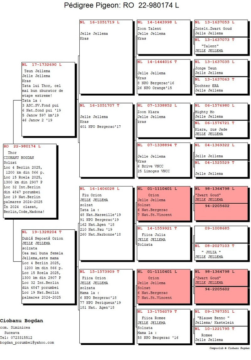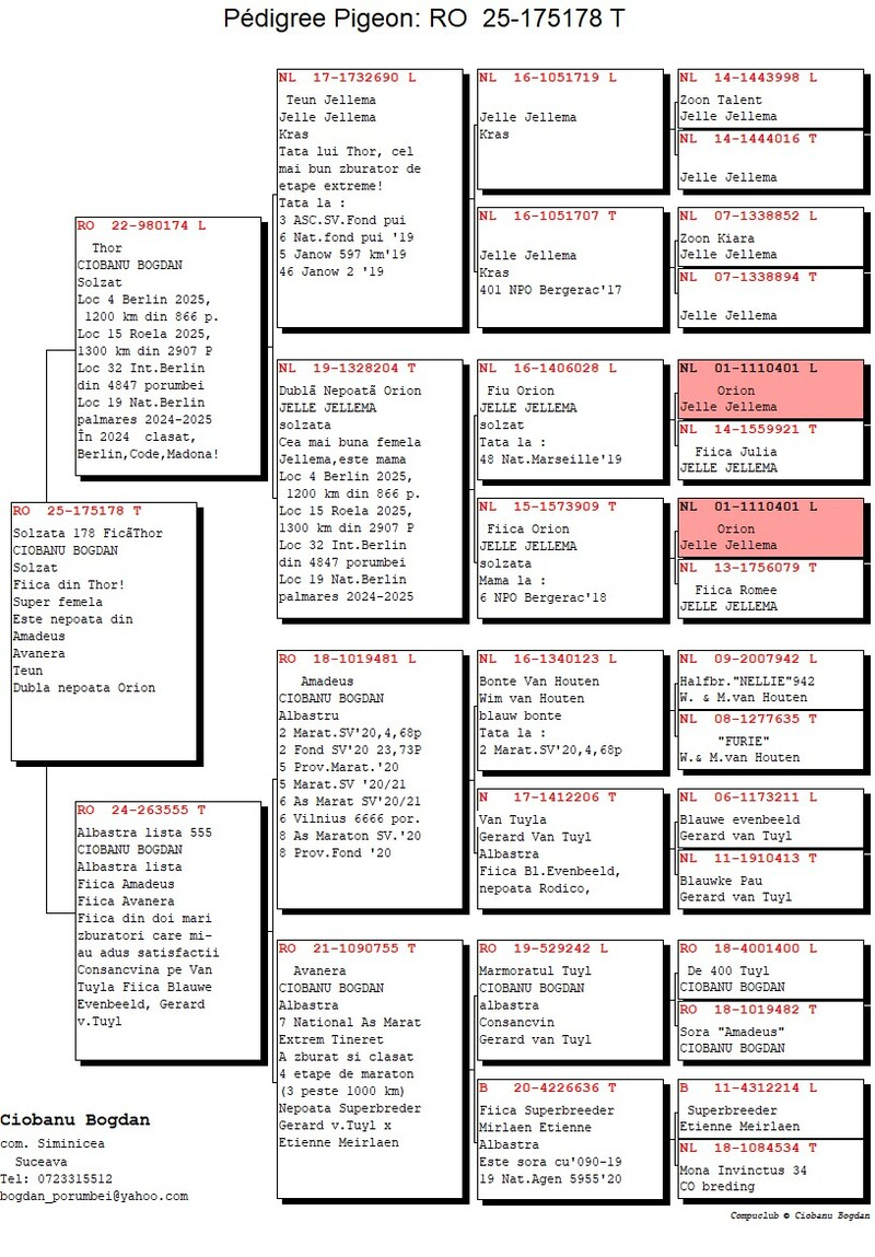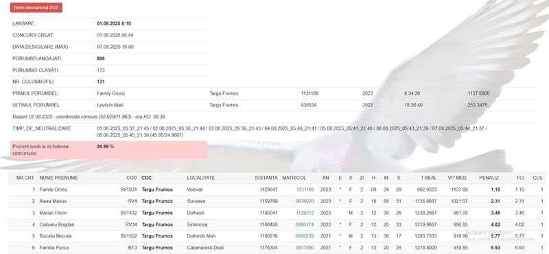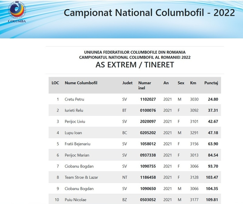 Seine nachgewiesenen Erfolge zeugen von einer professionellen und konsequenten Herangehensweise. Im Laufe der Jahre erreichte der Züchter aus Siminicea mehrfache Platzierungen in den Top 10 auf nationaler Ebene in den Kategorien Marathon und Fond, belegte den 1. Platz im Kreis Suceava bei Flügen von 800–1000 km und erzielte bemerkenswerte Ergebnisse bei schwierigen internationalen Wettbewerben in der Ukraine und Polen (z. B. Krasnodon). Die regelmäßige Teilnahme am Burdujeni–Suceava-Championat, einer der stärksten Regionen des Landes, bestätigt die Konstanz und Qualität seiner Zuchtlinie.