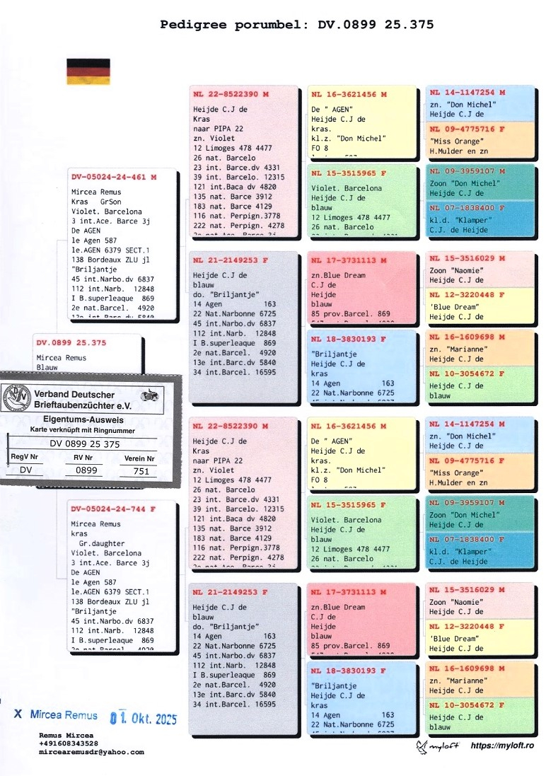 Die Auswahl der Vögel erfolgte mit größter Sorgfalt; jedes Exemplar wurde aufgrund seines wertvollen Stammbaums und seiner außergewöhnlichen Leistungen ausgewählt. Zu diesen herausragenden Linien zählen Nachkommen legendärer Tauben wie „Jonge Don Michel“, „Marianne“, „Diamantje“, „Smaragd“, „Milos“, „Miss Milos“ und „de Kleine Blauwe“. Gemeinsam bilden sie eine der stärksten Zuchtbasen, die je von einem rumänischen Züchter außerhalb der Landesgrenzen aufgebaut wurden.