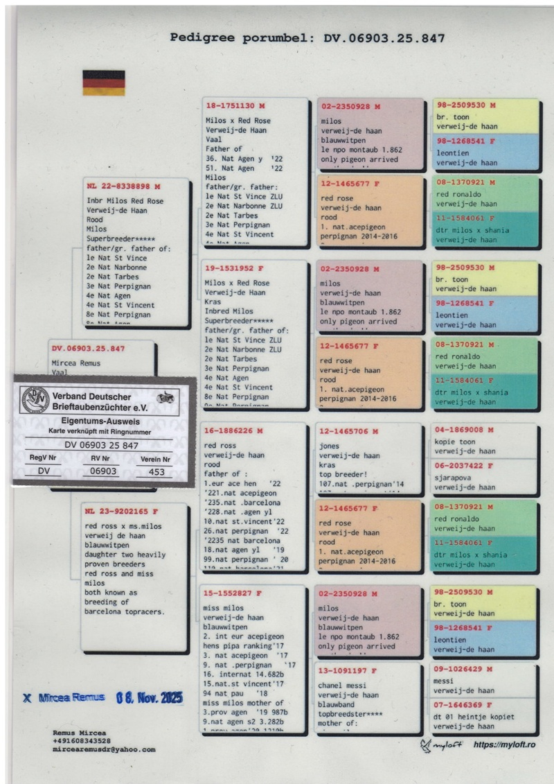 Durch Vision, Beharrlichkeit und strategische Investitionen hat Mircea Remus bewiesen, dass Exzellenz keine Grenzen kennt. Seine tiefe Leidenschaft für die Taubenzucht und der Wunsch, seine Erfahrungen mit anderen rumänischen Züchtern zu teilen, machen ihn zu einem Vorbild, Innovator und wahren Botschafter des rumänischen Taubensports in Europa.