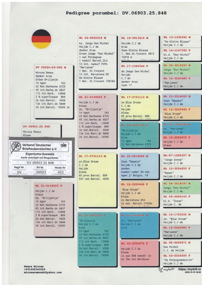 Die Auswahl der Vögel erfolgte mit größter Sorgfalt; jedes Exemplar wurde aufgrund seines wertvollen Stammbaums und seiner außergewöhnlichen Leistungen ausgewählt. Zu diesen herausragenden Linien zählen Nachkommen legendärer Tauben wie „Jonge Don Michel“„Marianne“„Diamantje“„Smaragd“„Milos“„Miss Milos“ und „de Kleine Blauwe“. Gemeinsam bilden sie eine der stärksten Zuchtbasen, die je von einem rumänischen Züchter außerhalb der Landesgrenzen aufgebaut wurden.