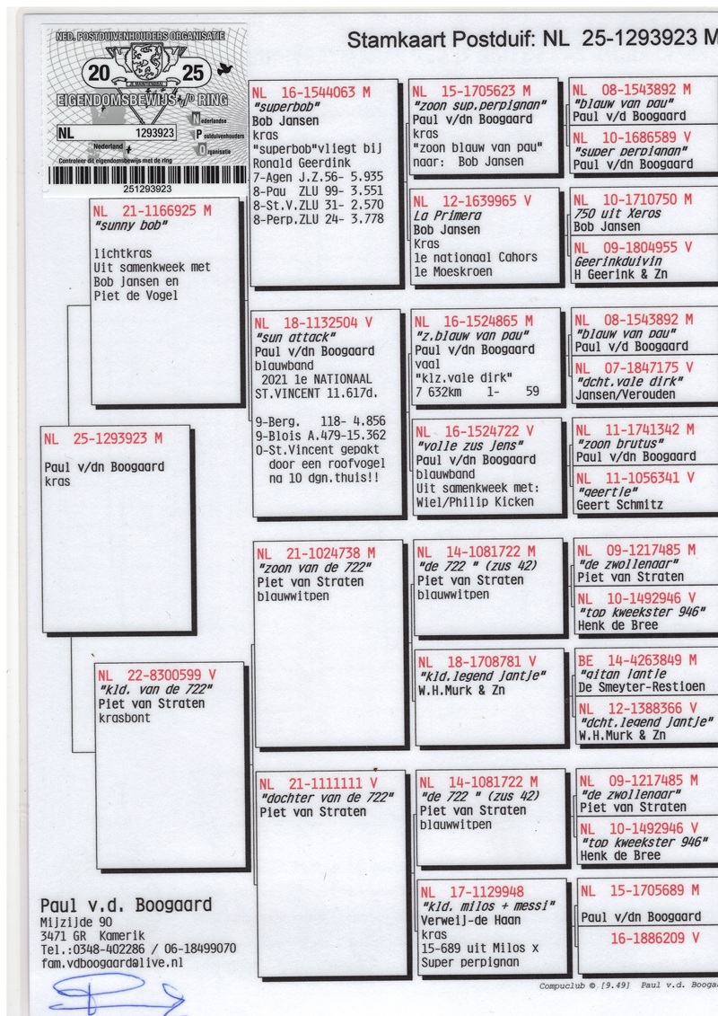 Obwohl er eine relativ kleine Taubengruppe besitzt, setzt Paul van den Boogaard in der Regel nicht mehr als fünf Tauben in jedem nationalen Wettbewerb ein. Trotzdem erreichte er im Jahr 2021 eine bemerkenswerte Leistung, als er das internationale Rennen von St. Vincent gewann. Dieser Erfolg festigte nicht nur seinen Ruf, sondern unterstrich auch seine Expertise in hochrangigen Wettbewerben und zeigte das Können, das er im Laufe seiner jahrzehntelangen Tätigkeit im Taubensport erworben hat.