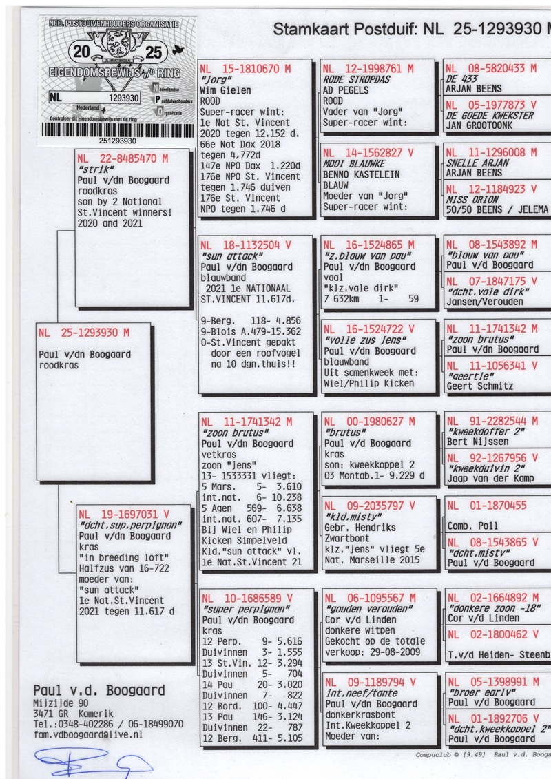 Obwohl er eine relativ kleine Taubengruppe besitzt, setzt Paul van den Boogaard in der Regel nicht mehr als fünf Tauben in jedem nationalen Wettbewerb ein. Trotzdem erreichte er im Jahr 2021 eine bemerkenswerte Leistung, als er das internationale Rennen von St. Vincent gewann. Dieser Erfolg festigte nicht nur seinen Ruf, sondern unterstrich auch seine Expertise in hochrangigen Wettbewerben und zeigte das Können, das er im Laufe seiner jahrzehntelangen Tätigkeit im Taubensport erworben hat.