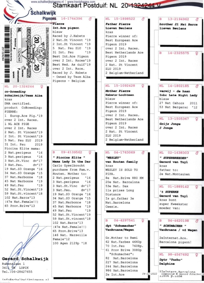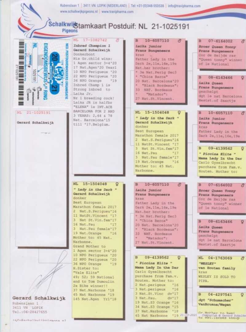 Diese Tauben stammen aus renommierten Blutlinien – Van der Wegen, De Heijde, Hagens und Belleter – Linien aus Vögeln mit nachgewiesenen Leistungen, sorgfältig ausgewählt, im Flug getestet und vorbereitet für die Elite-Marathons der kommenden Saisons (Bordeaux 2025, Barcelona 2026).