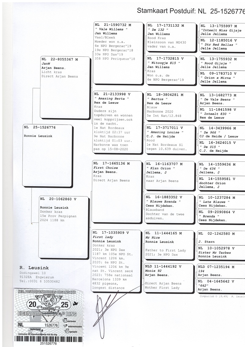 Ein entscheidender Faktor für Ronnies Erfolg war seine Zusammenarbeit mit dem Taubenschlag von Arjan Beens, dessen Vögel einen erheblichen Einfluss auf seine Leistungen hatten. Darüber hinaus führte diese Zusammenarbeit zur Entstehung einer dauerhaften Freundschaft. In seinem Zuchtabteil befinden sich Nachkommen von berühmten Tauben wie „Snelle Jelle“, „Marianne“, „Miss Gijsje“, „Roodmeisje“, „Mr. Bergerac“, „Rika“, „Dancing Moonlight“, „Miss Brive“, „Miss Sjaan“ und „Red Thunder“, was zur Konsolidierung einer erfolgreichen Blutlinie und zur Weitergabe wertvoller Gene in der Welt des Taubensports beiträgt.