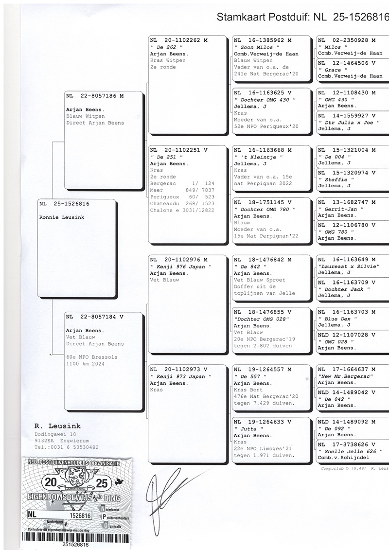 Ein entscheidender Faktor für Ronnies Erfolg war seine Zusammenarbeit mit dem Taubenschlag von Arjan Beens, dessen Vögel einen erheblichen Einfluss auf seine Leistungen hatten. Darüber hinaus führte diese Zusammenarbeit zur Entstehung einer dauerhaften Freundschaft. In seinem Zuchtabteil befinden sich Nachkommen von berühmten Tauben wie „Snelle Jelle“, „Marianne“, „Miss Gijsje“, „Roodmeisje“, „Mr. Bergerac“, „Rika“, „Dancing Moonlight“, „Miss Brive“, „Miss Sjaan“ und „Red Thunder“, was zur Konsolidierung einer erfolgreichen Blutlinie und zur Weitergabe wertvoller Gene in der Welt des Taubensports beiträgt.