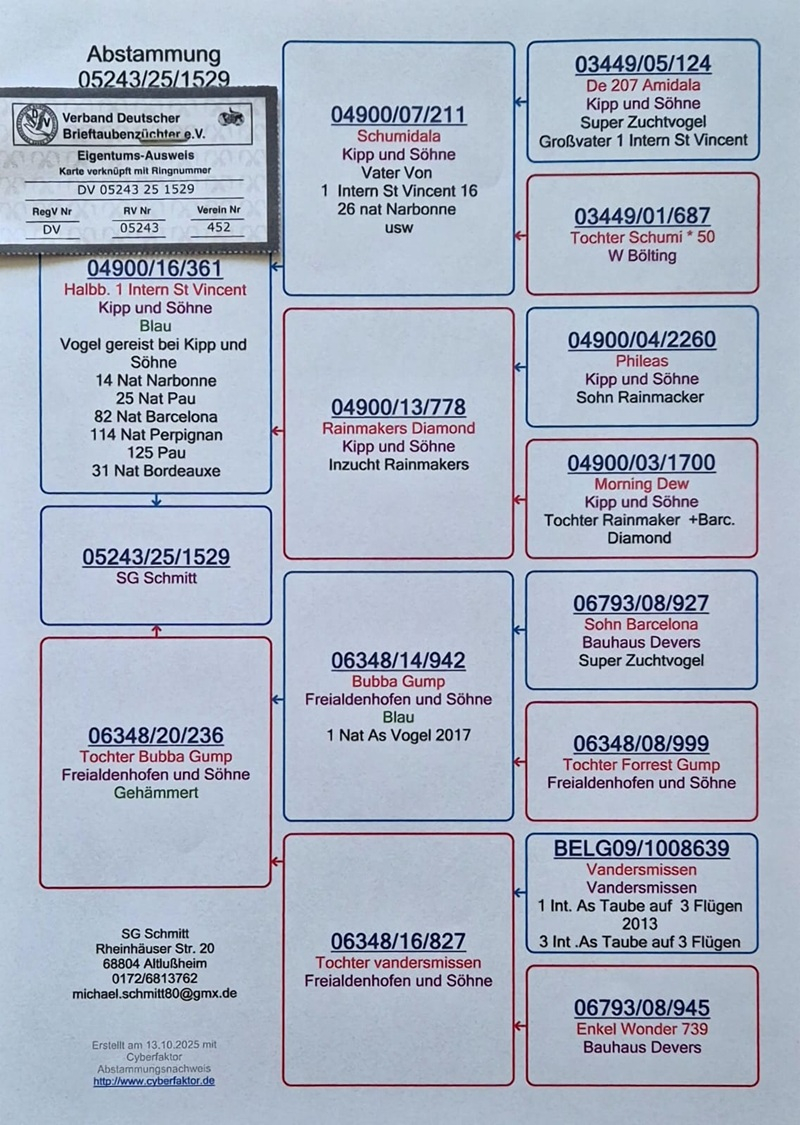 Die SG-Schmitt-Tauben stammen aus einem führenden deutschen Schlag, der für konstante Spitzenleistungen bei Weitstrecken-, Extrem-Weitstrecken- und Marathonflügen bekannt ist – auch unter schwierigen Wetterbedingungen. Die Erfolge basieren auf einer strengen Selektion ausschließlich nach realen Flugergebnissen, wobei jede Taube intensiv auf Ausdauer, Orientierung und sichere Heimkehr aus großen Distanzen geprüft wird.