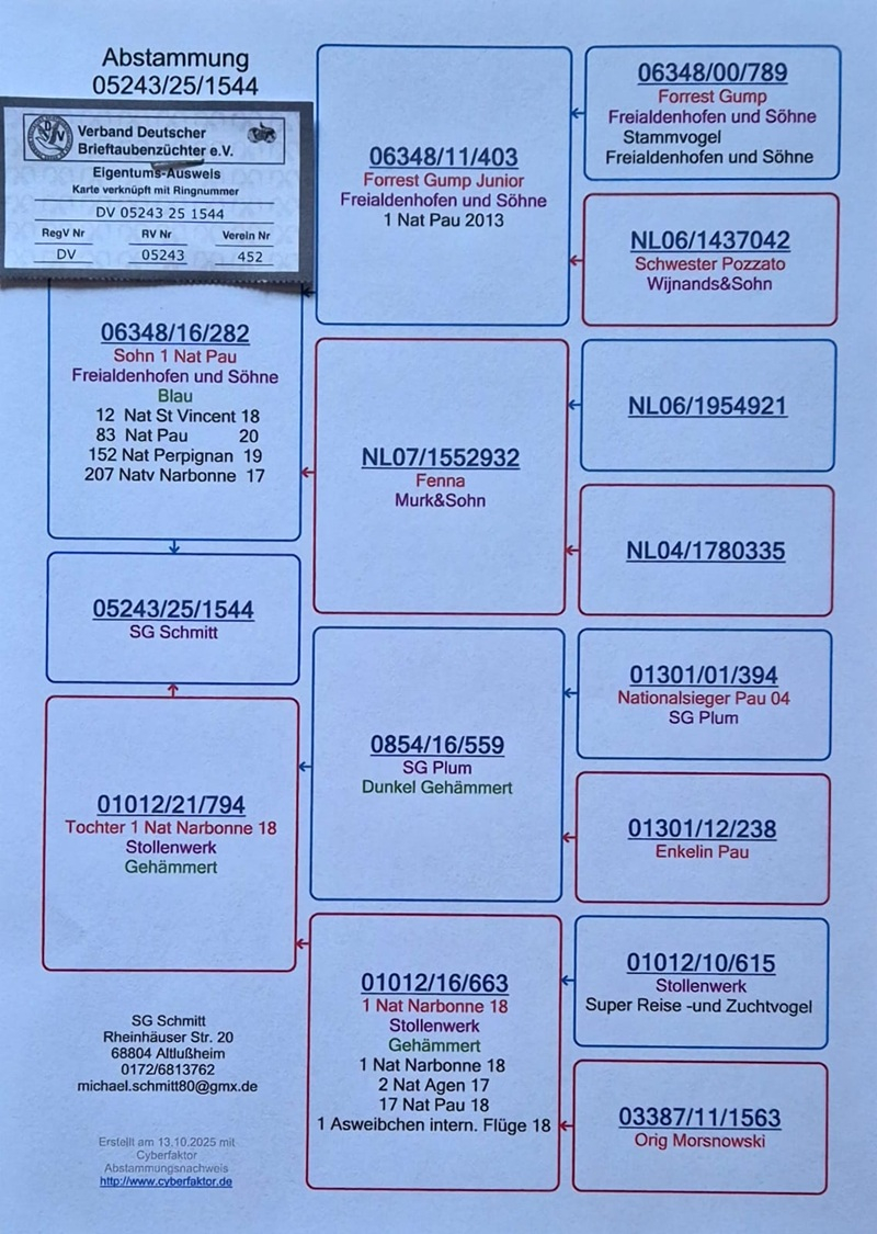 Die SG-Schmitt-Tauben stammen aus einem führenden deutschen Schlag, der für konstante Spitzenleistungen bei Weitstrecken-, Extrem-Weitstrecken- und Marathonflügen bekannt ist – auch unter schwierigen Wetterbedingungen. Die Erfolge basieren auf einer strengen Selektion ausschließlich nach realen Flugergebnissen, wobei jede Taube intensiv auf Ausdauer, Orientierung und sichere Heimkehr aus großen Distanzen geprüft wird.
