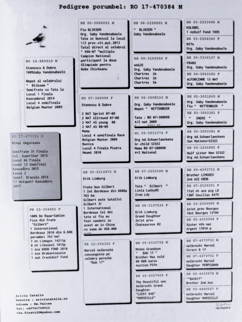 Durch kluge Zukäufe von renommierten rumänischen Züchtern – darunter Stănescu & Dobre, Cosmin Olteanu und Cătălin Ariciu – gelang es Ungureanu, eine solide genetische Basis aufzubauen, auf der er seinen Aufstieg in die Elite des lokalen, regionalen und nationalen Brieftaubensports gründete.