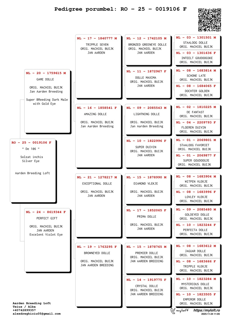 Aarden Breeding Loft Rumänien, gelegen im Kreis Alba, hebt sich als bemerkenswerter Maßstab in Osteuropa hervor, mit dem Hauptziel, die außergewöhnlichen Eigenschaften der Jan-Aarden-Tauben zu bewahren und zu fördern. Gegründet vor einigen Jahren, beherbergt dieses Zentrum Elite-Exemplare von Aarden-Tauben, die von Machiel Buijk stammen, dem weltweit anerkannten bedeutendsten Züchter dieser Taubenfamilie. Die Nachkommen dieser Vögel haben beeindruckende Siege in hoch anspruchsvollen Marathonwettbewerben errungen und tragen das genetische Erbe der berühmten Taube Dolle, die in fast jedem Stammbaum vertreten ist.