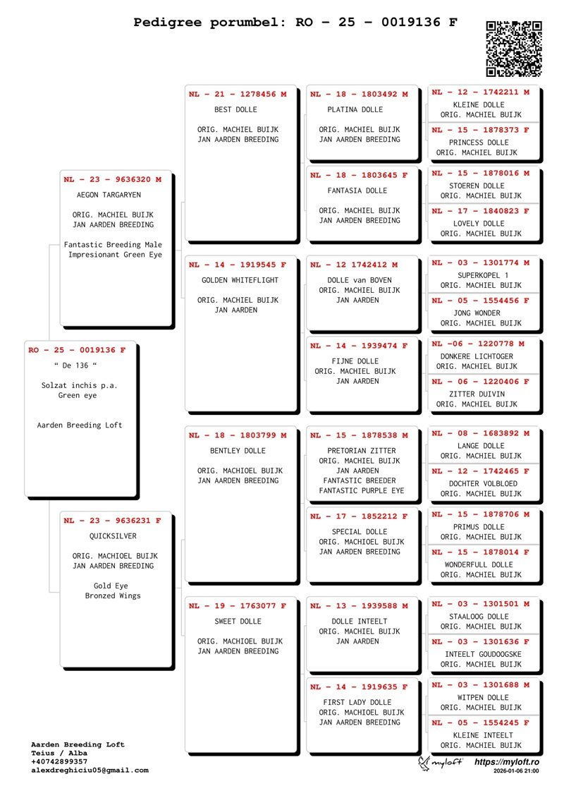Aarden Breeding Loft Rumänien, gelegen im Kreis Alba, hebt sich als bemerkenswerter Maßstab in Osteuropa hervor, mit dem Hauptziel, die außergewöhnlichen Eigenschaften der Jan-Aarden-Tauben zu bewahren und zu fördern. Gegründet vor einigen Jahren, beherbergt dieses Zentrum Elite-Exemplare von Aarden-Tauben, die von Machiel Buijk stammen, dem weltweit anerkannten bedeutendsten Züchter dieser Taubenfamilie. Die Nachkommen dieser Vögel haben beeindruckende Siege in hoch anspruchsvollen Marathonwettbewerben errungen und tragen das genetische Erbe der berühmten Taube Dolle, die in fast jedem Stammbaum vertreten ist.