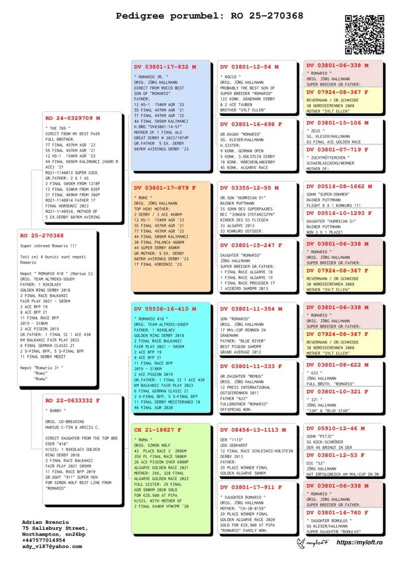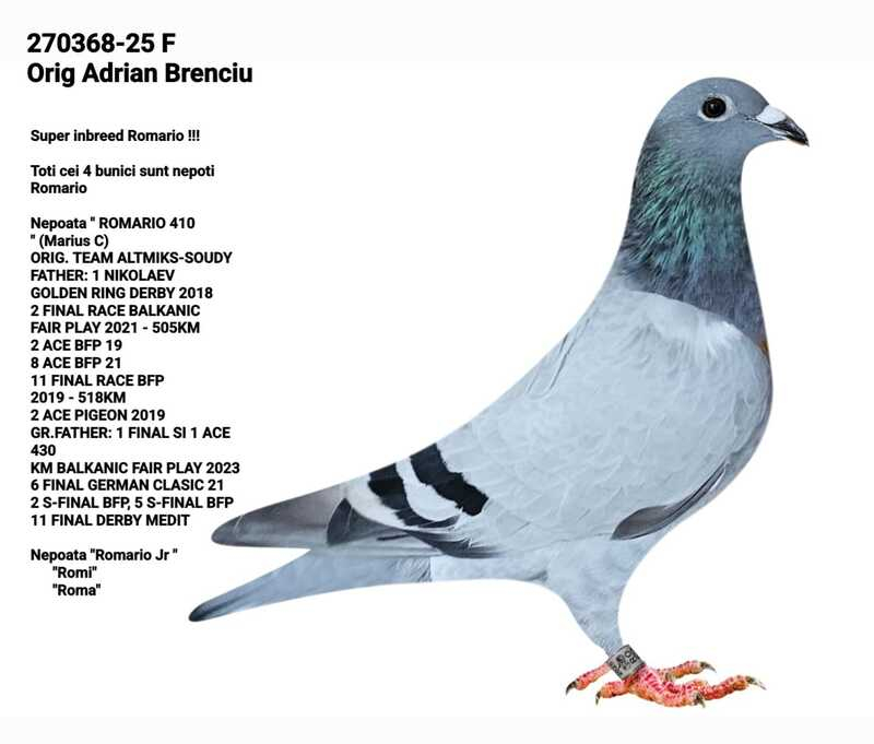 In den letzten Jahren hat sich Adrian Brenciu durch seine professionelle Herangehensweise ausgezeichnet: eine präzise Auswahl der Zuchttauben, stetige Sorge um Gesundheit und Vitalität seiner Tiere sowie eine wohlüberlegte Teilnahme an Langstreckenrennen. Seine Tauben werden in einer ausgewogenen Umgebung aufgezogen, mit Schwerpunkt auf Robustheit, Heimfindungsinstinkt, Erholungsfähigkeit und Ausdauer – Eigenschaften, die für den Erfolg im Marathon unerlässlich sind.
