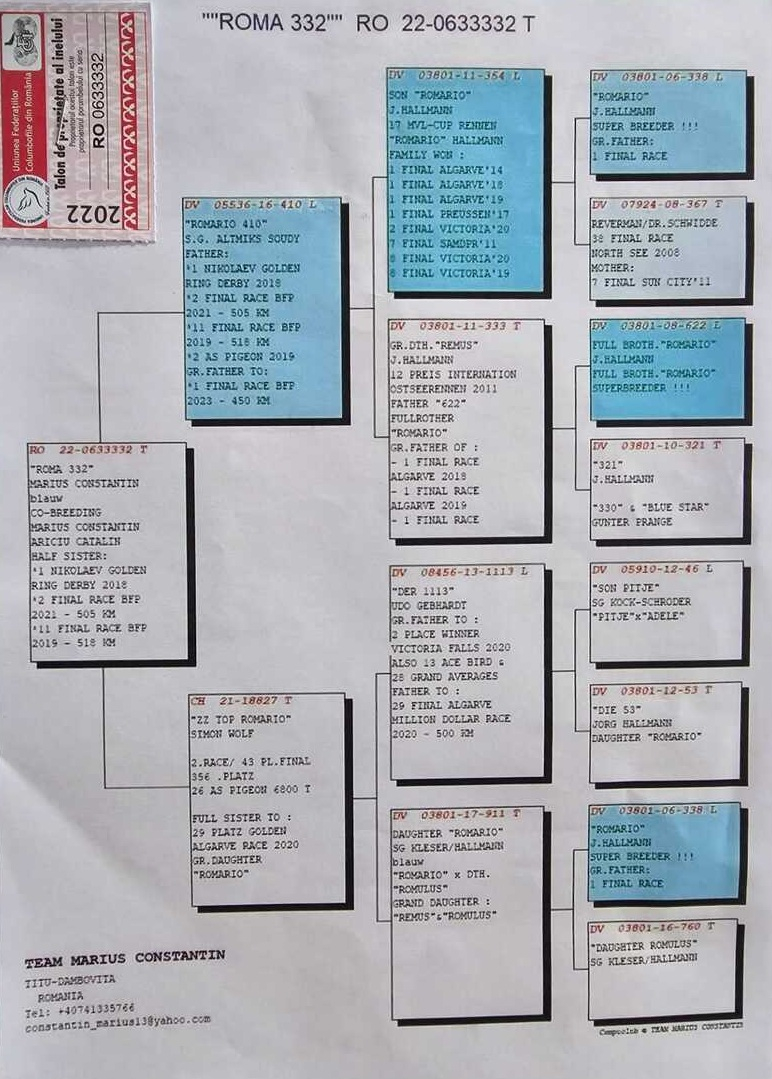 Der genetische Wert der von Adrian Brenciu gezüchteten Tauben wird auch durch die Erfolge anderer namhafter Züchter bestätigt, die seine Linien in ihre Schläge integriert haben: