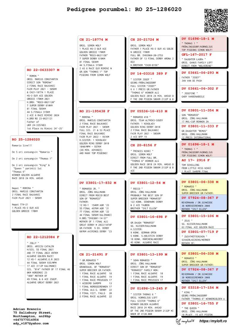 In den letzten Jahren hat sich Adrian Brenciu durch seine professionelle Herangehensweise ausgezeichnet: eine präzise Auswahl der Zuchttauben, stetige Sorge um Gesundheit und Vitalität seiner Tiere sowie eine wohlüberlegte Teilnahme an Langstreckenrennen. Seine Tauben werden in einer ausgewogenen Umgebung aufgezogen, mit Schwerpunkt auf Robustheit, Heimfindungsinstinkt, Erholungsfähigkeit und Ausdauer – Eigenschaften, die für den Erfolg im Marathon unerlässlich sind.