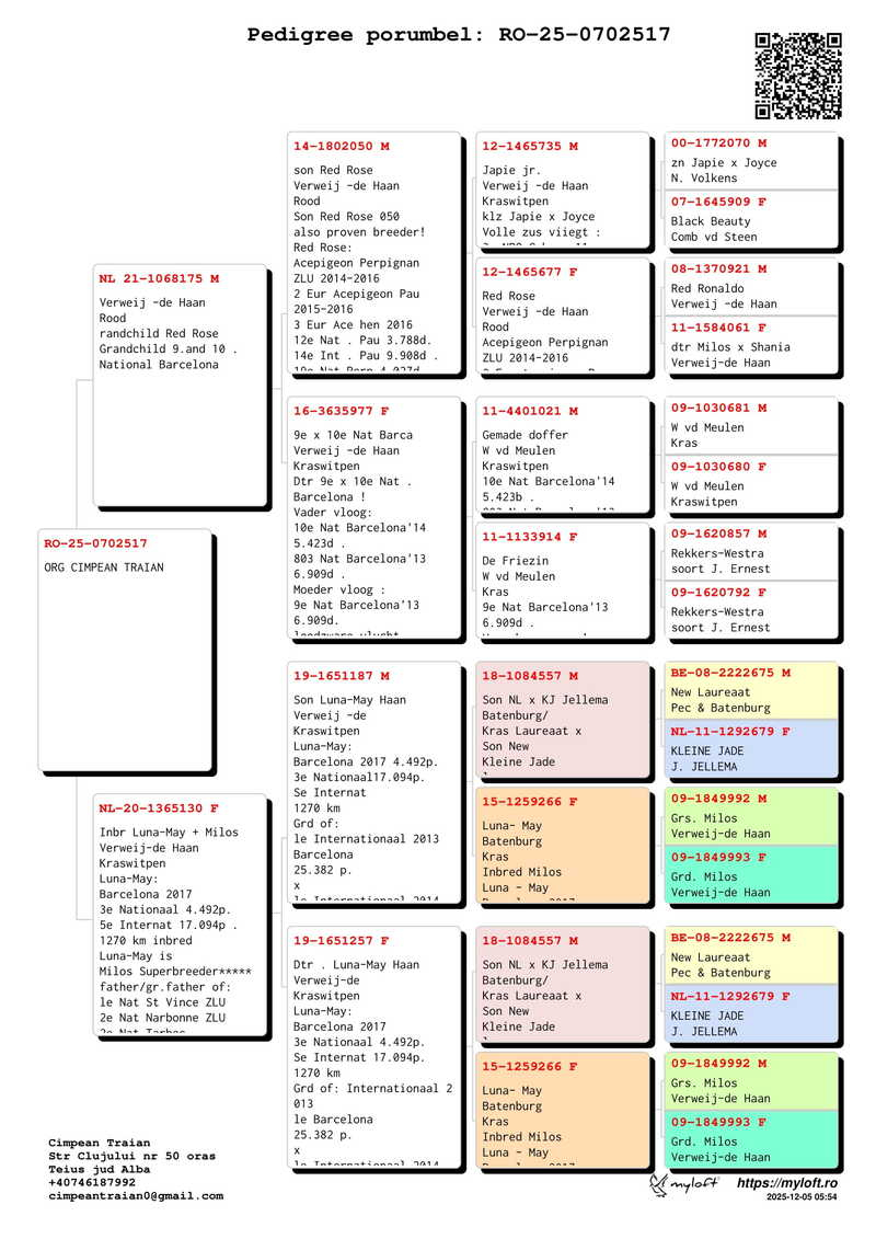 Traian Cîmpean zeichnet sich als engagierter Züchter mit profundem Fachwissen in der Brieftaubenzucht aus, was es ihm ermöglicht, diese Disziplin auf höchstem Leistungsniveau auszuüben. Bereits zu Beginn seiner Laufbahn erkannte er, dass Erfolg auf einer hochwertigen Zuchtbasis beruhen muss, und die im Laufe der Zeit erzielten Ergebnisse haben diese Vision bestätigt. Sein Zuchtschlag wurde durch die sorgfältige Integration von Tauben renommierter rumänischer Züchter sowie durch wertvolle genetische Linien aus Westeuropa maßgeblich gestärkt.