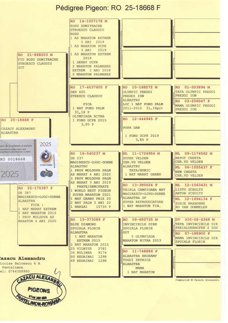 Mit einer beeindruckenden Zuchtbasis von über 350 Zuchttauben, darunter 100 für den Marathon spezialisiert, führt Cazacu eine der bestorganisierten Zuchtanlagen des Landes. Seine Tauben stammen aus renommierten europäischen Blutlinien – Koopman, Vandenabeele, Van den Bulck, Heremans, Hooymans, Jelle Jellema, Cor de Heijde, Pollin, Hebberecht, Vandenheede u. a. – sorgfältig ausgewählt für jede Wettbewerbskategorie.