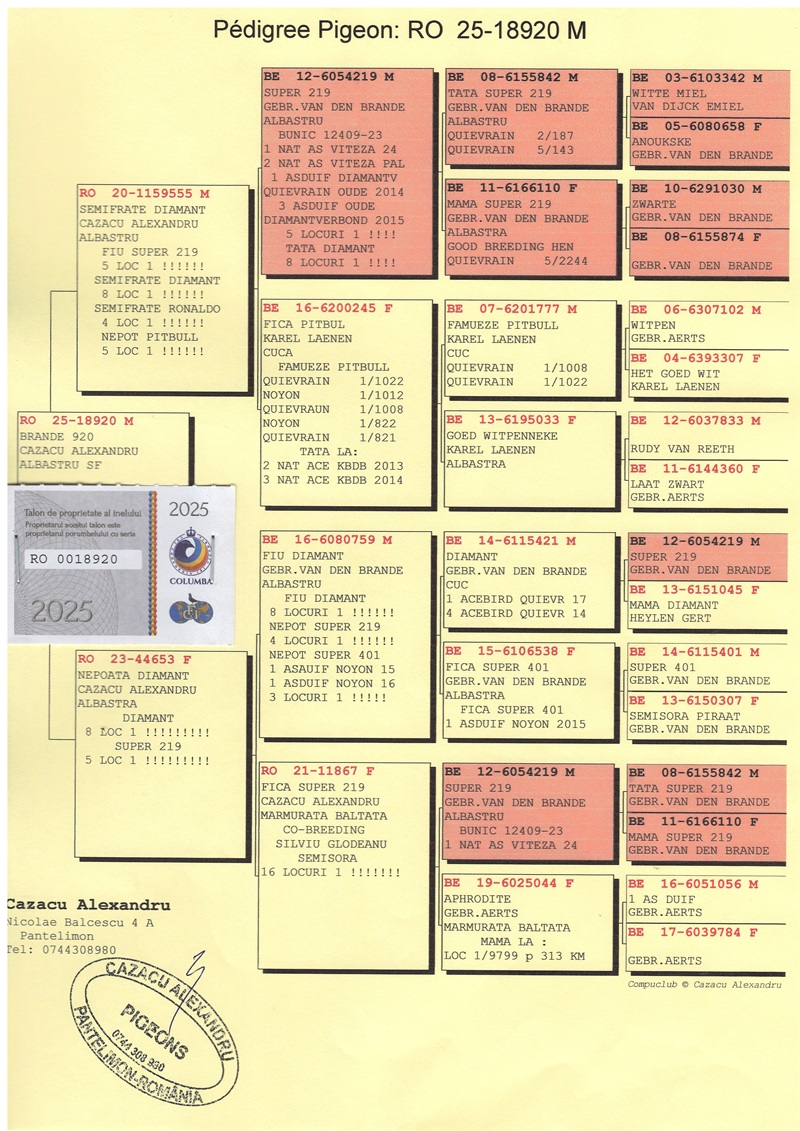 Mit einem Bestand von über 350 Zuchtpaaren, davon 100 auf den Marathon spezialisiert, führt Alexandru Cazacu eine der bestorganisierten Zuchten des Landes. Seine Tauben stammen aus den renommiertesten europäischen Blutlinien – Koopman, Vandenabeele, Van den Bulck, Heremans, Hooymans, Verweij-de Haan Comb., Jelle Jellema, Cor de Hejde, P. Boyen, Bart Geerinckx, M. & G. Pollin, Chris Hebberecht, Freddy Vandenheede, Jan van de Pasch – sorgfältig ausgewählt für jede einzelne Kategorie.