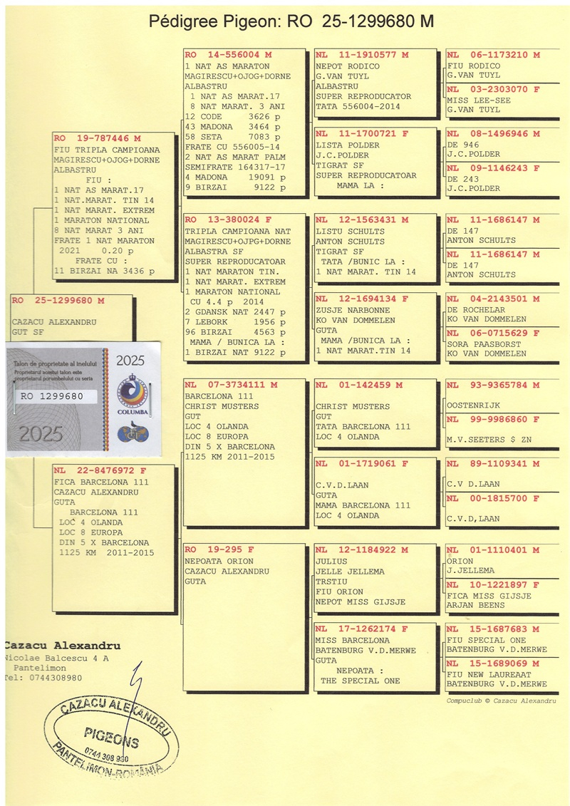 Mit einem Bestand von über 350 Zuchtpaaren, davon 100 auf den Marathon spezialisiert, führt Alexandru Cazacu eine der bestorganisierten Zuchten des Landes. Seine Tauben stammen aus den renommiertesten europäischen Blutlinien – Koopman, Vandenabeele, Van den Bulck, Heremans, Hooymans, Verweij-de Haan Comb., Jelle Jellema, Cor de Hejde, P. Boyen, Bart Geerinckx, M. & G. Pollin, Chris Hebberecht, Freddy Vandenheede, Jan van de Pasch – sorgfältig ausgewählt für jede einzelne Kategorie.