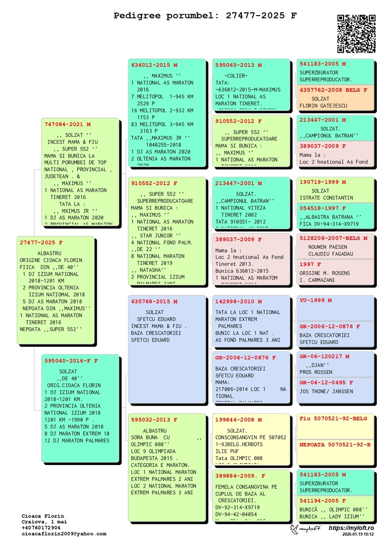 Schon in jungen Jahren von der Taubenzucht fasziniert, verwandelte Cioacă Florin seine Leidenschaft in eine wahre Wissenschaft der Leistung. Durch eine sorgfältige Selektion, die auf fundierten genetischen Kriterien basiert, und durch ein methodisches Trainingssystem gelang es ihm, eine Taubenlinie zu schaffen, die für Ausgewogenheit, Kraft und ausgeprägten Wettbewerbsgeist bekannt ist. Seine Erfolge sind kein Zufall, sondern das Ergebnis harter Arbeit, Disziplin und einer klaren Vision für die Zukunft des leistungsorientierten Brieftaubensports.