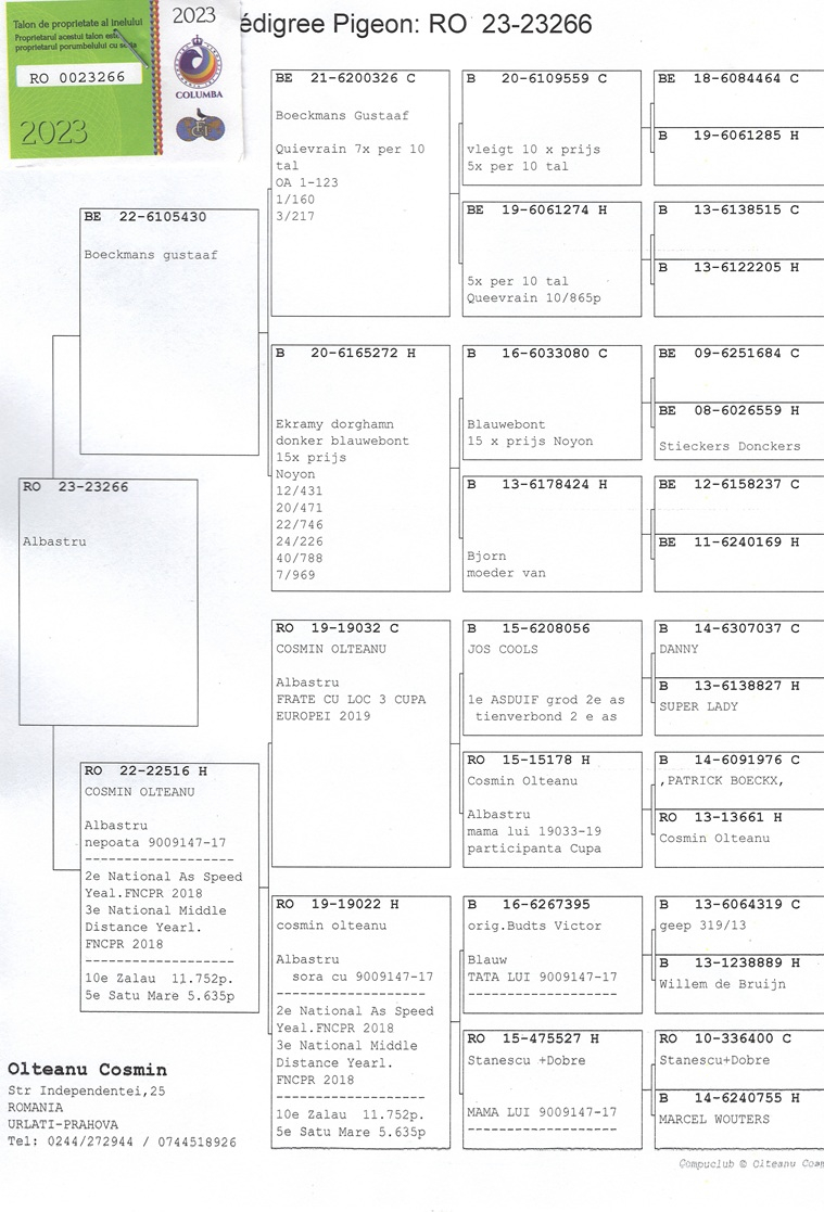 Seine beiden Weibchen, RO-20-0020655 und RO-20-0020011, belegten die ersten beiden nationalen Plätze sowohl im Schnellflug als auch in der Mitteldistanz – eine seltene Leistung und ein klarer Beweis für die Konstanz und genetische Qualität seiner Tauben. Insgesamt gewann Cosmin Olteanu sechs nationale Trophäen, darunter drei erste Plätze, alle errungen mit diesen beiden außergewöhnlichen Weibchen.