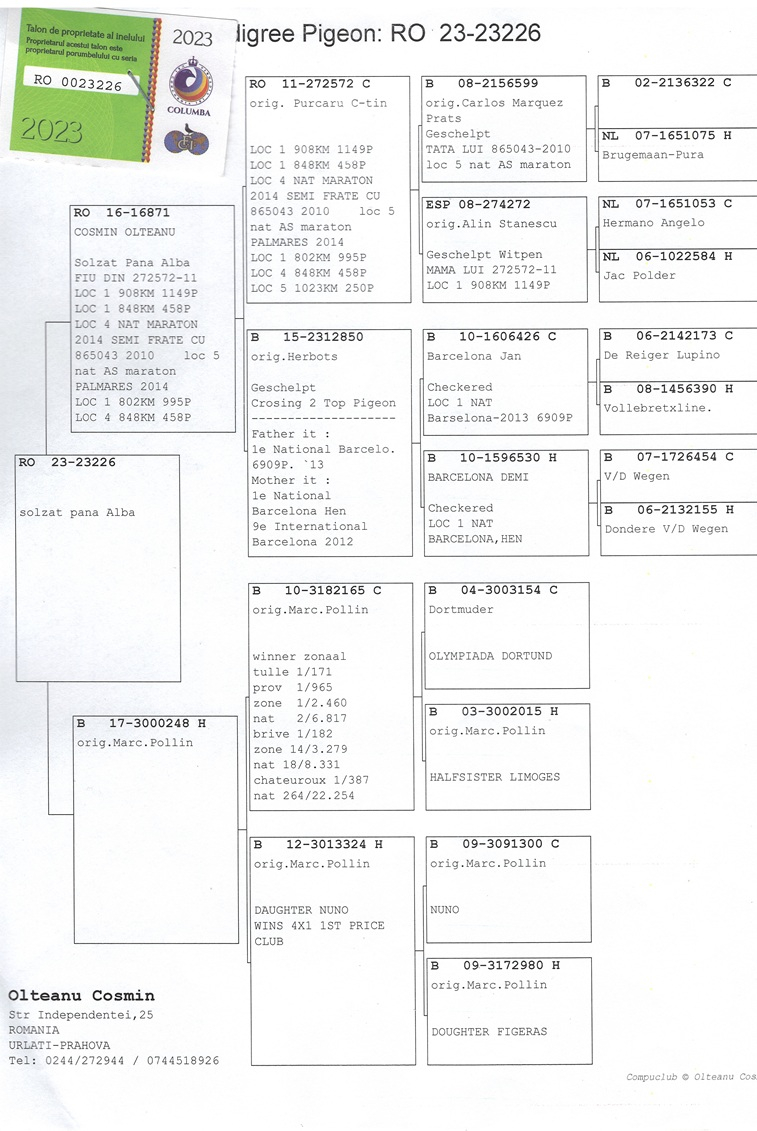 Seine beiden Weibchen, RO-20-0020655 und RO-20-0020011, belegten die ersten beiden nationalen Plätze sowohl im Schnellflug als auch in der Mitteldistanz – eine seltene Leistung und ein klarer Beweis für die Konstanz und genetische Qualität seiner Tauben. Insgesamt gewann Cosmin Olteanu sechs nationale Trophäen, darunter drei erste Plätze, alle errungen mit diesen beiden außergewöhnlichen Weibchen.