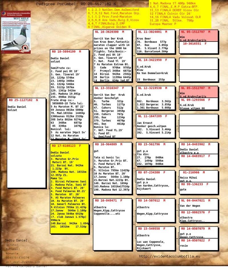 Daniel Dediu hat sich im Kreis Botoșani einen soliden Ruf als führender Experte im Bereich des Taubensports aufgebaut. Seit 2005 nimmt er aktiv an verschiedenen Wettbewerben teil, darunter allgemeine Wettkämpfe, Langstreckenrennen, Marathons und One Loft Races (OLR).