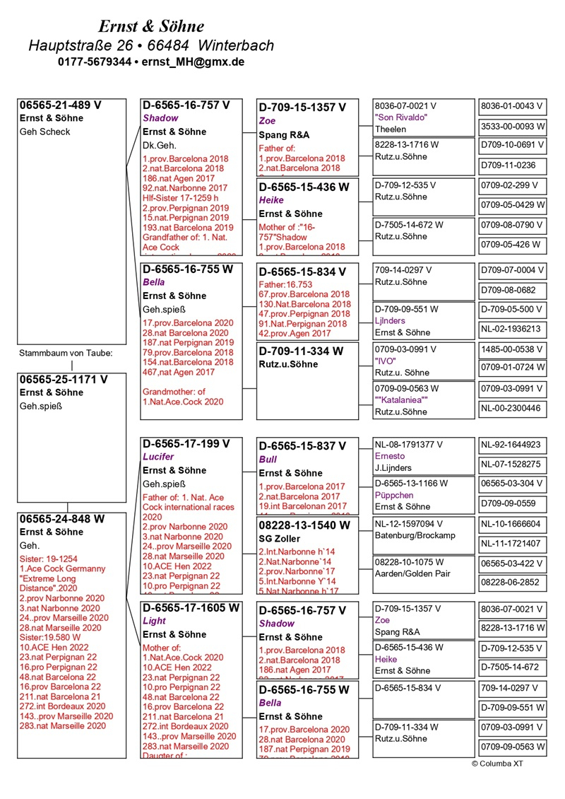 Die Beständigkeit dieser Leistungen wurde zudem durch Spitzenplatzierungen in den deutschen nationalen Ranglisten bestätigt. Im Jahr 2019 belegte die Familie Ernst den 3. Platz in der deutschen Nationalwertung für internationale Flüge, mit hervorragenden Resultaten bei Pau, Barcelona, Saint Vincent, Marseille, Narbonne, Brive und Perpignan. Im Jahr 2020 erreichte das Team Platz 20 in derselben Wertung und errang zugleich den Titel des As-Taube Nr. 1 Deutschlands bei internationalen Flügen.