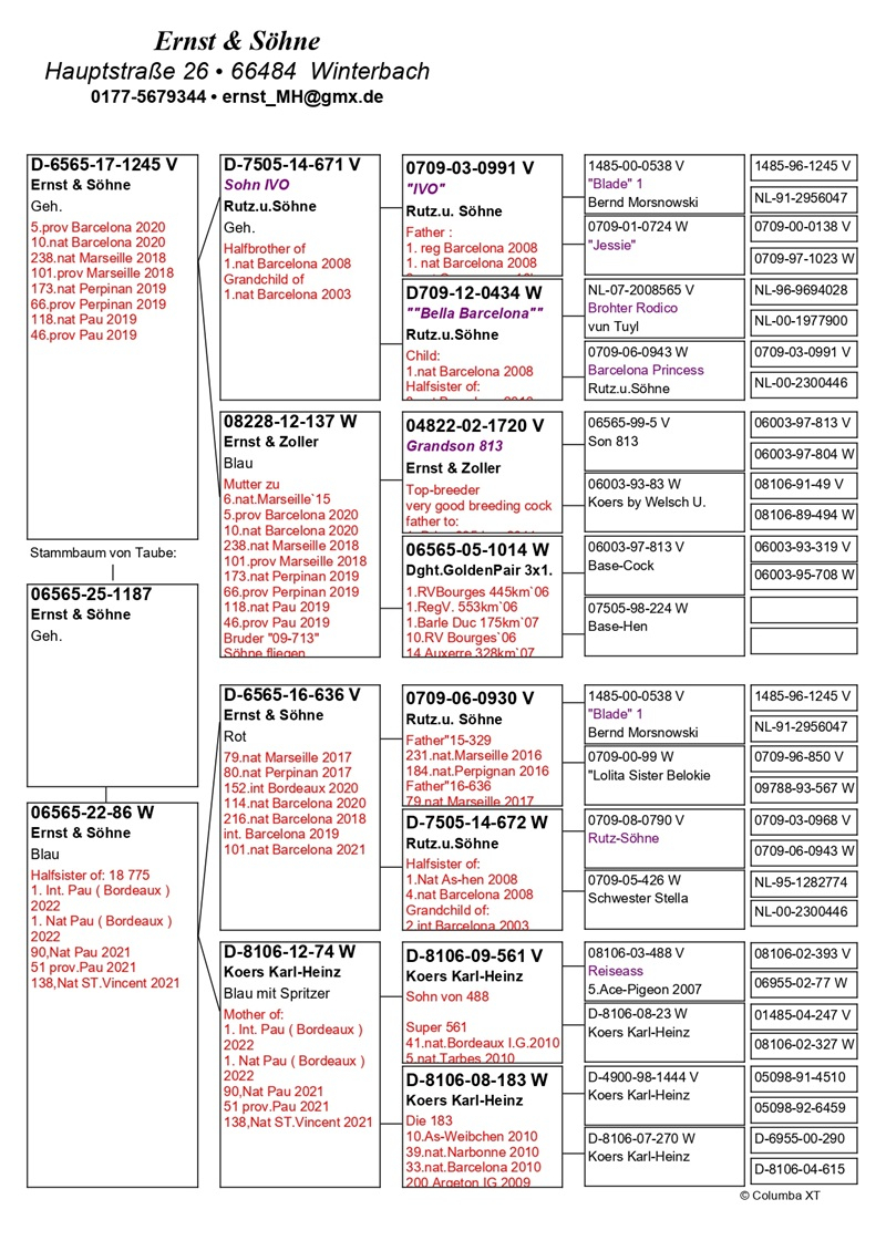 Die Beständigkeit dieser Leistungen wurde zudem durch Spitzenplatzierungen in den deutschen nationalen Ranglisten bestätigt. Im Jahr 2019 belegte die Familie Ernst den 3. Platz in der deutschen Nationalwertung für internationale Flüge, mit hervorragenden Resultaten bei Pau, Barcelona, Saint Vincent, Marseille, Narbonne, Brive und Perpignan. Im Jahr 2020 erreichte das Team Platz 20 in derselben Wertung und errang zugleich den Titel des As-Taube Nr. 1 Deutschlands bei internationalen Flügen.