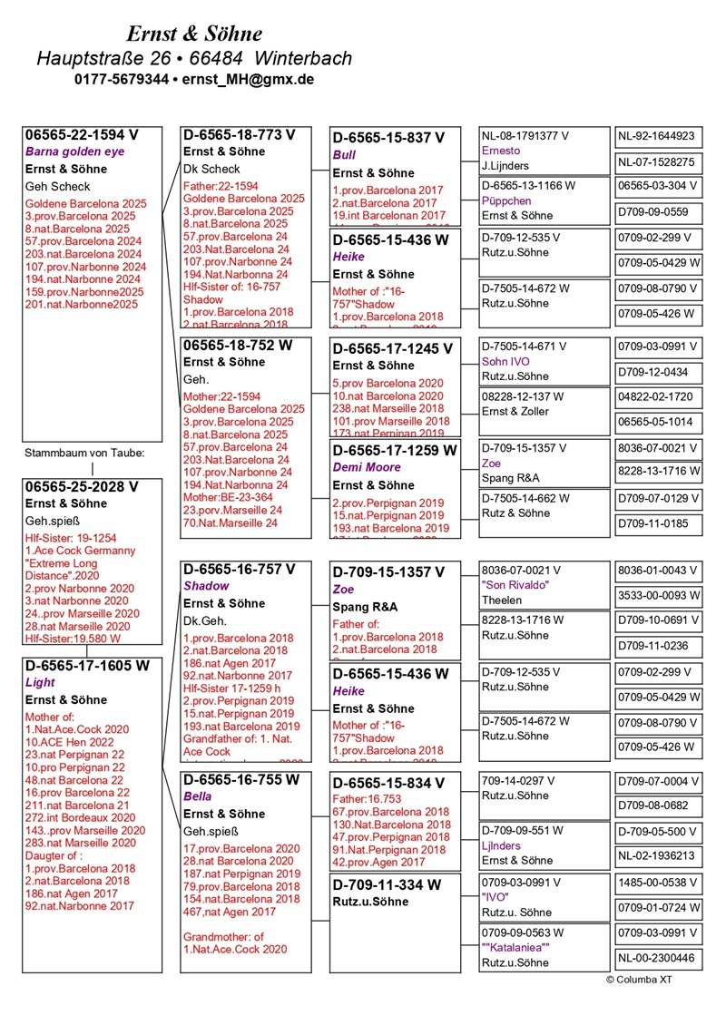 Bis einschließlich 2023 konnte die Familie Ernst ihr hohes Leistungsniveau halten und erreichte Spitzenplatzierungen bei bedeutenden Wettbewerben wie Barcelona, Arcis-sur-Aube, Vivonne, Auxerre und Saint Dizier – sowohl auf nationaler als auch auf internationaler Ebene. Diese Konstanz spiegelt nicht nur den genetischen Wert der Tauben wider, sondern auch die Disziplin, Hingabe und Leidenschaft, die die Tätigkeit der Familie Ernst prägen und ihren Status als Vorbild für Exzellenz im Brieftaubensport bestätigen.