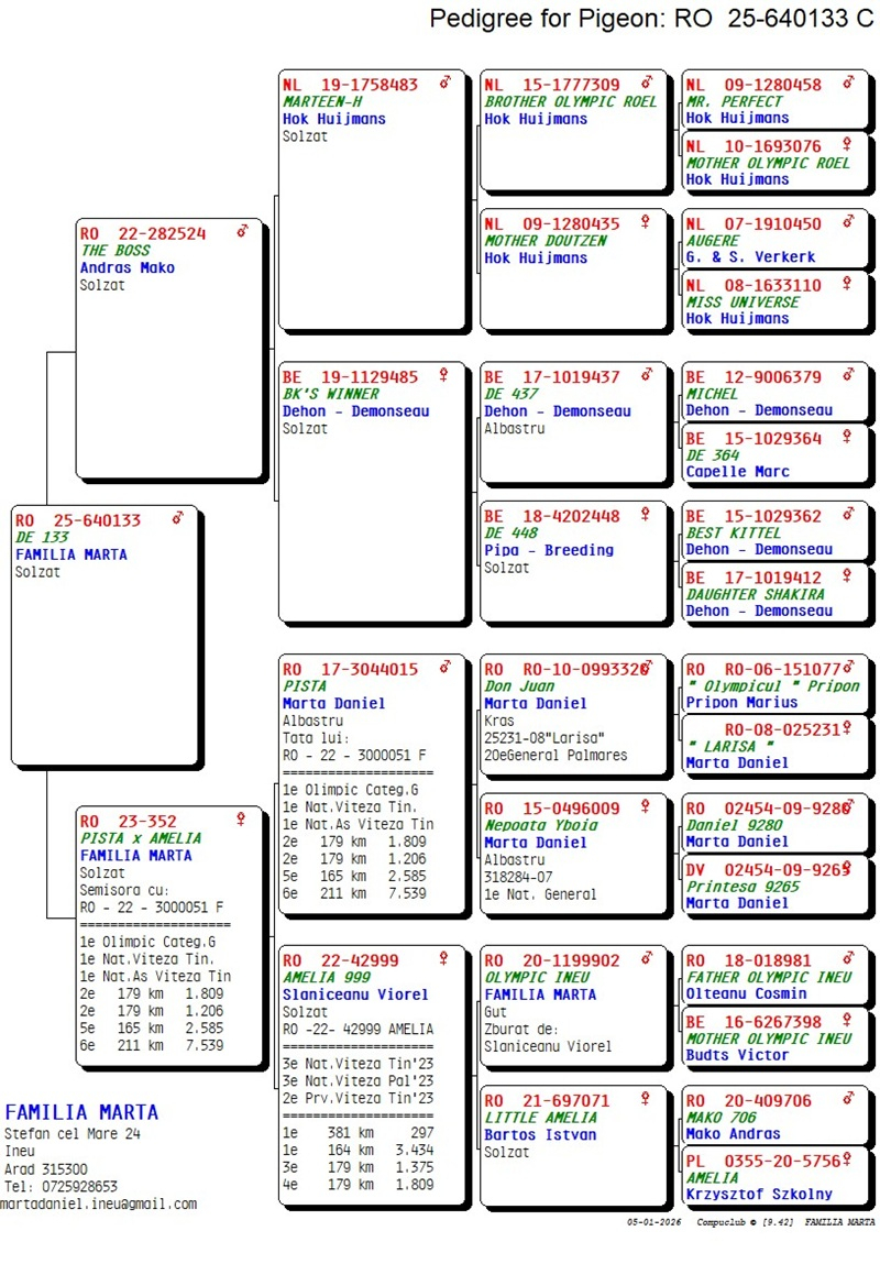 Marta Daniel, ursprünglich aus Ineu, Kreis Arad, ist bekannt für seine bemerkenswerte Leidenschaft für den Taubensport, eine edle und fesselnde Tradition, die tief in den ländlichen Gebieten Rumäniens verwurzelt ist. Sein Hof strahlt Vitalität und Eleganz aus, belebt durch den anmutigen Flug seiner Tauben, wobei jede Taube mit großer Sorgfalt und tiefer Hingabe gepflegt wird. Jede Taube, ob erfahrener Reiseflieger oder junges Exemplar, verkörpert den tiefen Respekt, den Daniel für diese Geschöpfe hegt.