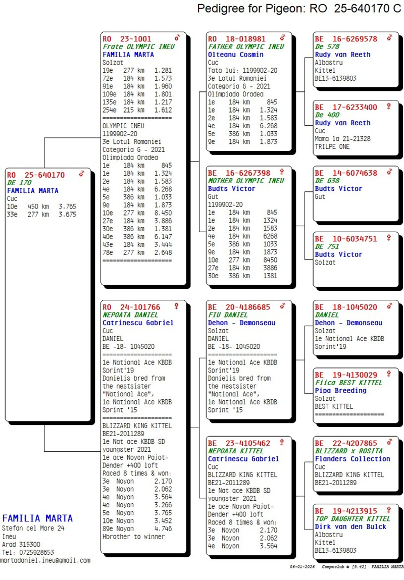Im Laufe der Jahre hat sich Daniel den Respekt der Taubenzüchtergemeinschaft erworben, nicht nur durch seine Ergebnisse, sondern auch durch die Hingabe und Sorgfalt, mit der er seine Volieren pflegt und seinen Tauben das bestmögliche Umfeld für ihre Entwicklung bietet. Seine Taubenzucht in Ineu ist ein wahres Heiligtum des Friedens und der Leidenschaft, wo die alten Traditionen der Taubenzucht harmonisch mit seiner aufrichtigen Liebe zu diesen edlen Vögeln, den Symbolen des Taubensports, verschmelzen.