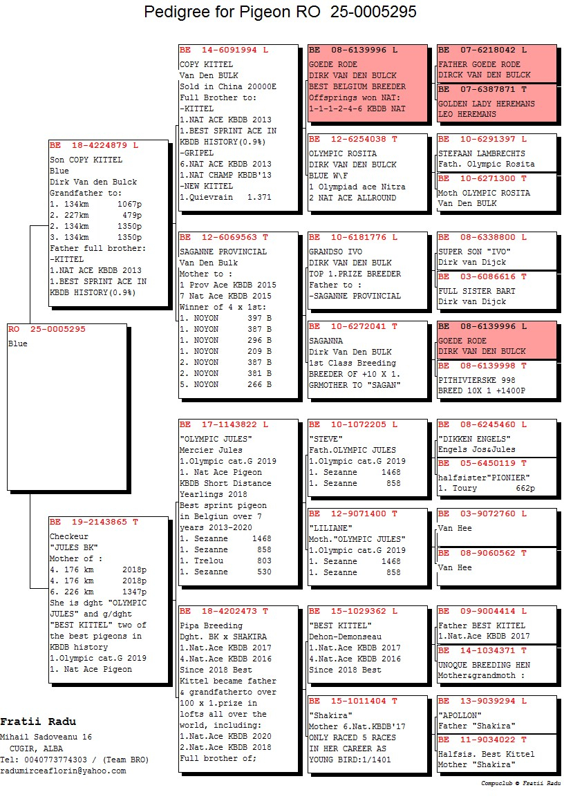 Die Familie Radu (Team BRO) aus Cugir, Kreis Alba, ist ein bekannter Name im rumänischen Taubensport und bekannt für ihre Leidenschaft und beeindruckenden Leistungen in Geschwindigkeits- und Mittelstreckenrennen über Distanzen von 100 bis 500 Kilometern. Im Laufe der Jahre hat das Team herausragende Ergebnisse auf Kreis-, Provinz- und nationaler Ebene erzielt und besonders in Wettbewerben für Jungtauben geglänzt. In einer Region, die für ihre schwierigen Flugbedingungen bekannt ist, hat die Familie Radu gezeigt, dass durch Engagement und qualitativ hochwertige Tauben bedeutende nationale Erfolge möglich sind.