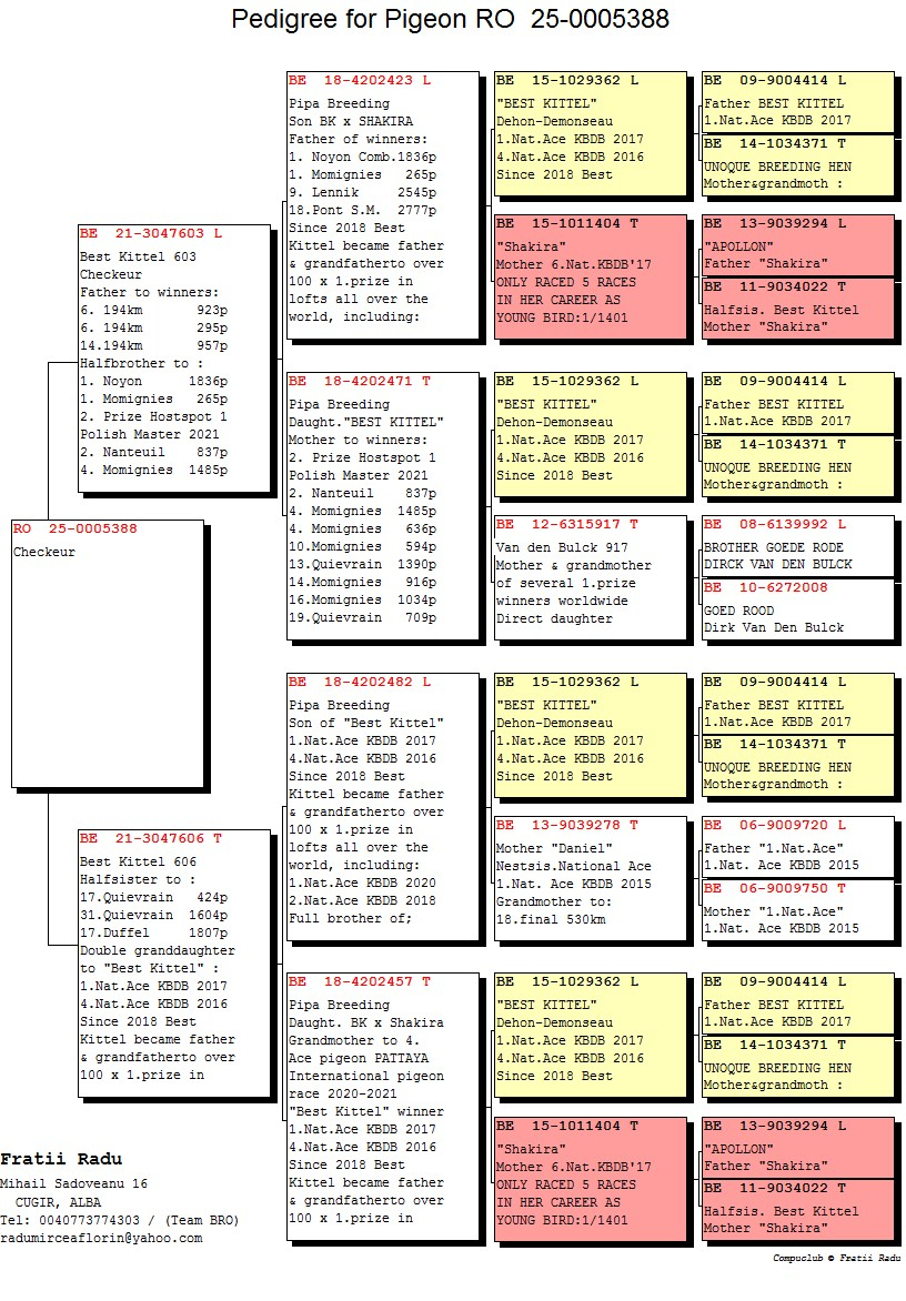 Die Familie Radu (Team BRO) aus Cugir, Kreis Alba, ist ein bekannter Name im rumänischen Taubensport und bekannt für ihre Leidenschaft und beeindruckenden Leistungen in Geschwindigkeits- und Mittelstreckenrennen über Distanzen von 100 bis 500 Kilometern. Im Laufe der Jahre hat das Team herausragende Ergebnisse auf Kreis-, Provinz- und nationaler Ebene erzielt und besonders in Wettbewerben für Jungtauben geglänzt. In einer Region, die für ihre schwierigen Flugbedingungen bekannt ist, hat die Familie Radu gezeigt, dass durch Engagement und qualitativ hochwertige Tauben bedeutende nationale Erfolge möglich sind.