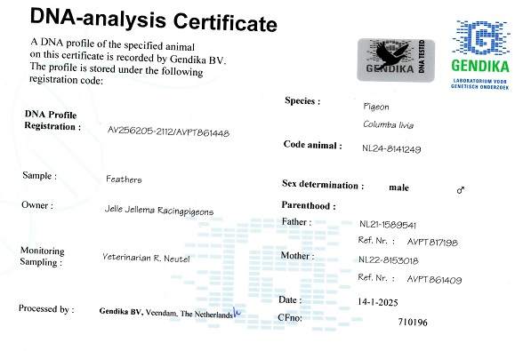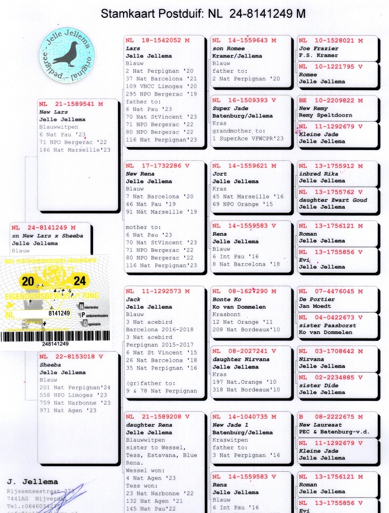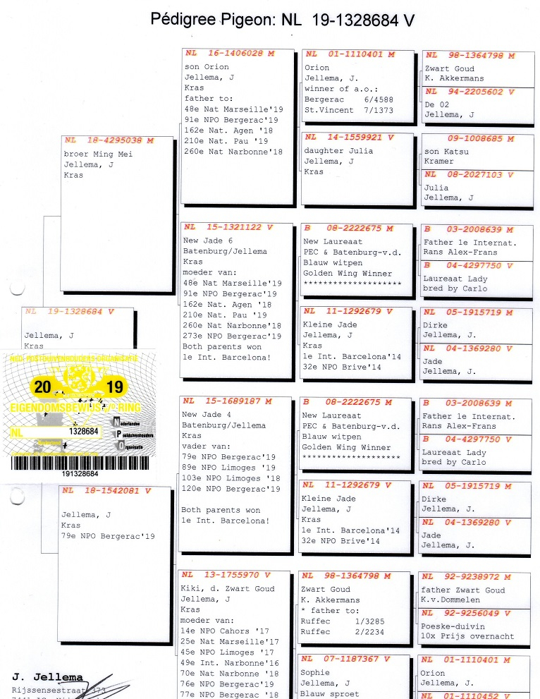 Im Laufe der Jahre beherbergte sein Schlag Tauben von einigen der größten Marathonmeister Europas: Etienne Meirlaen, Wim Muller, Cor de Heijde, Kipp & Söhne, Jelle Jellema, Rex de Leuw, sowie Originale von Andreeas Drapa, G. van Tuyl, Benno Kastelein, Gero Dijk und Ronald Geerdink (100% Cor de Heijde). Diese sorgfältige Auswahl hat eine starke genetische Linie gefestigt, die darauf ausgelegt ist, Spitzenleistungen im Marathon, auf der Kurzstrecke, Mittelstrecke und Allround zu erbringen.