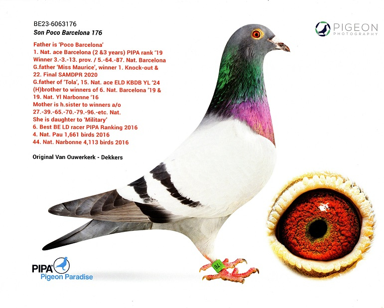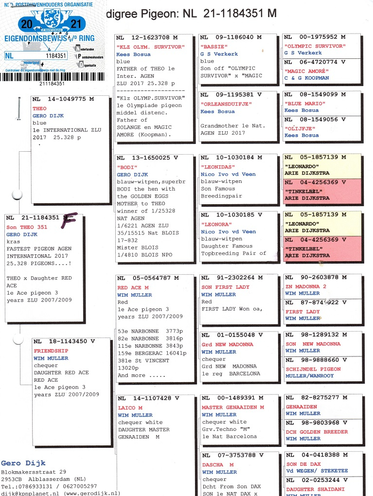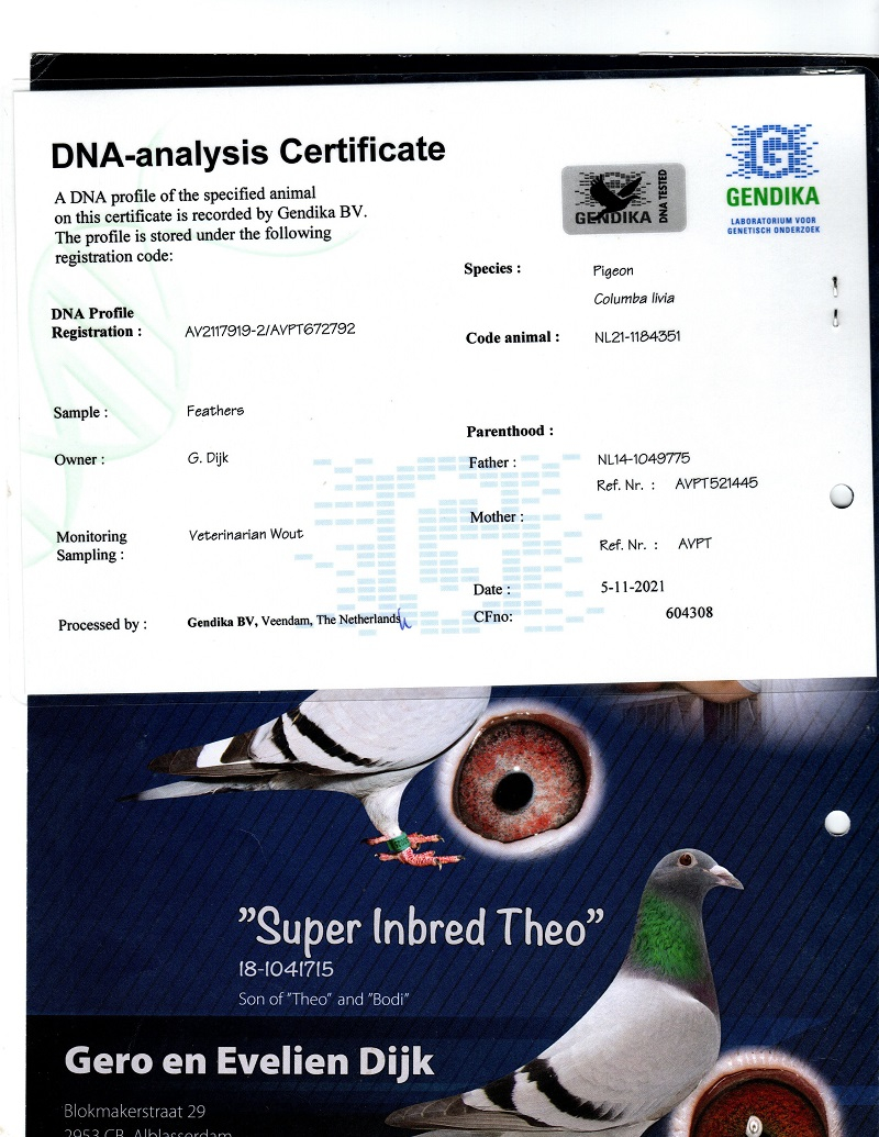 Im Laufe der Jahre beherbergte sein Schlag Tauben von einigen der größten Marathonmeister Europas: Etienne Meirlaen, Wim Muller, Cor de Heijde, Kipp & Söhne, Jelle Jellema, Rex de Leuw, sowie Originale von Andreeas Drapa, G. van Tuyl, Benno Kastelein, Gero Dijk und Ronald Geerdink (100% Cor de Heijde). Diese sorgfältige Auswahl hat eine starke genetische Linie gefestigt, die darauf ausgelegt ist, Spitzenleistungen im Marathon, auf der Kurzstrecke, Mittelstrecke und Allround zu erbringen.