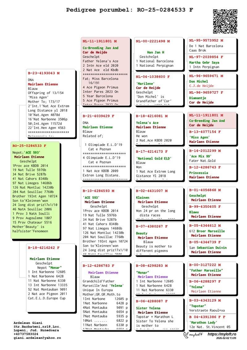 Im Laufe der Jahre beherbergte sein Schlag Tauben von einigen der größten Marathonmeister Europas: Etienne Meirlaen, Wim Muller, Cor de Heijde, Kipp & Söhne, Jelle Jellema, Rex de Leuw, sowie Originale von Andreeas Drapa, G. van Tuyl, Benno Kastelein, Gero Dijk und Ronald Geerdink (100% Cor de Heijde). Diese sorgfältige Auswahl hat eine starke genetische Linie gefestigt, die darauf ausgelegt ist, Spitzenleistungen im Marathon, auf der Kurzstrecke, Mittelstrecke und Allround zu erbringen.