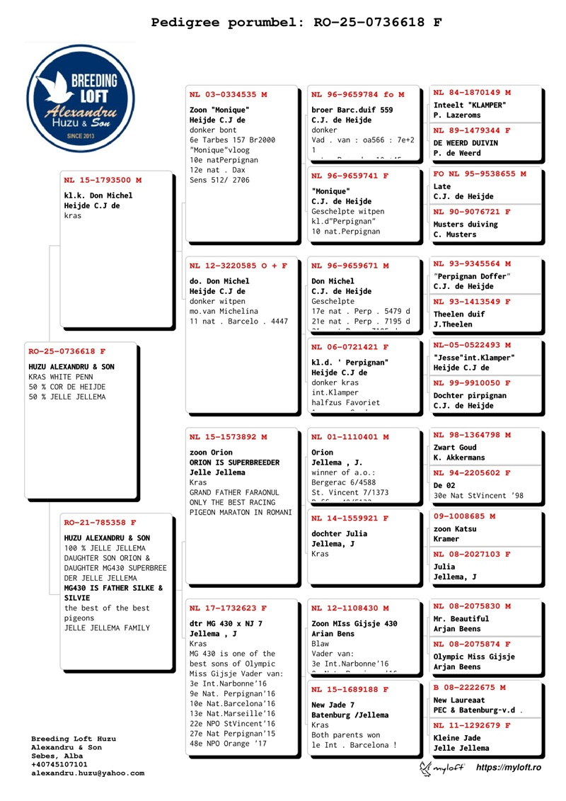 Alexandru Huzu hat es durch außergewöhnliche Anstrengungen und strenge Selektionsstrategien geschafft, seine Zuchtanlage zu einer der wertvollsten in Osteuropa zu machen. Er hat in Importe von den angesehensten Taubenzüchtern der Welt investiert, die sich auf verschiedene Kategorien wie Geschwindigkeit, Mittelstrecke, Langstrecke und Marathon spezialisiert haben. Zu diesen Züchtern gehören Jelle Jellema, Gaby Vandenabeele, die Familie Herbots, Pieter Veenstra, Jan Hoymans, Hans Eijerkamp, Dr. Brokamp, Anton und Luci van der Wegen, Ko van Domelen, Nouwen Paesen und viele andere.