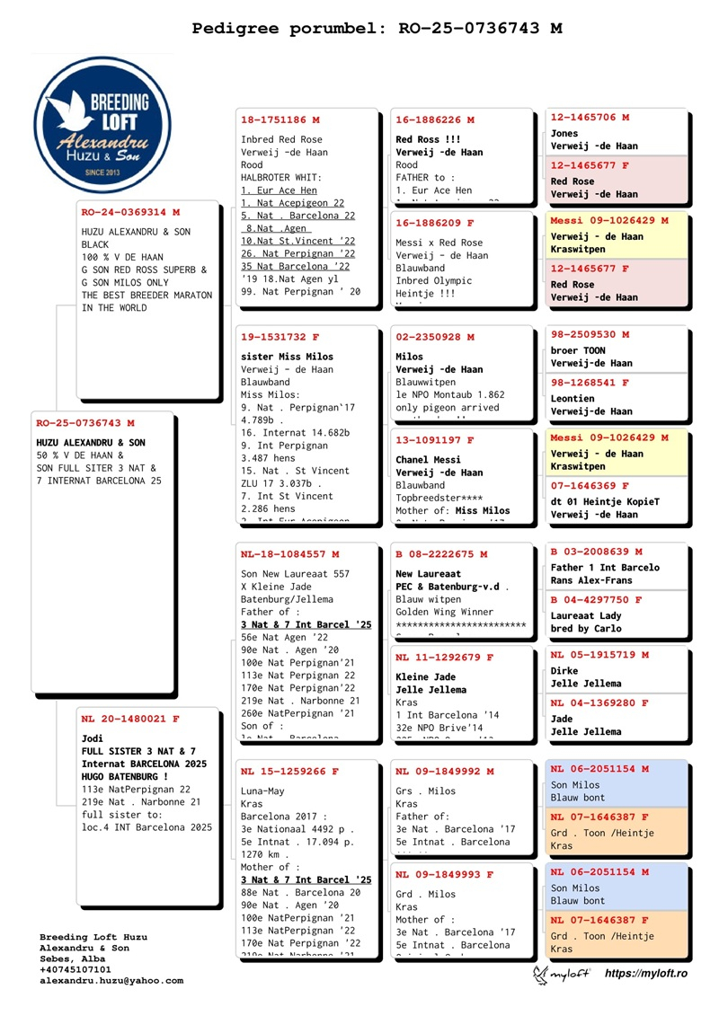 Alexandru Huzu hat es durch außergewöhnliche Anstrengungen und strenge Selektionsstrategien geschafft, seine Zuchtanlage zu einer der wertvollsten in Osteuropa zu machen. Er hat in Importe von den angesehensten Taubenzüchtern der Welt investiert, die sich auf verschiedene Kategorien wie Geschwindigkeit, Mittelstrecke, Langstrecke und Marathon spezialisiert haben. Zu diesen Züchtern gehören Jelle Jellema, Gaby Vandenabeele, die Familie Herbots, Pieter Veenstra, Jan Hoymans, Hans Eijerkamp, Dr. Brokamp, Anton und Luci van der Wegen, Ko van Domelen, Nouwen Paesen und viele andere.