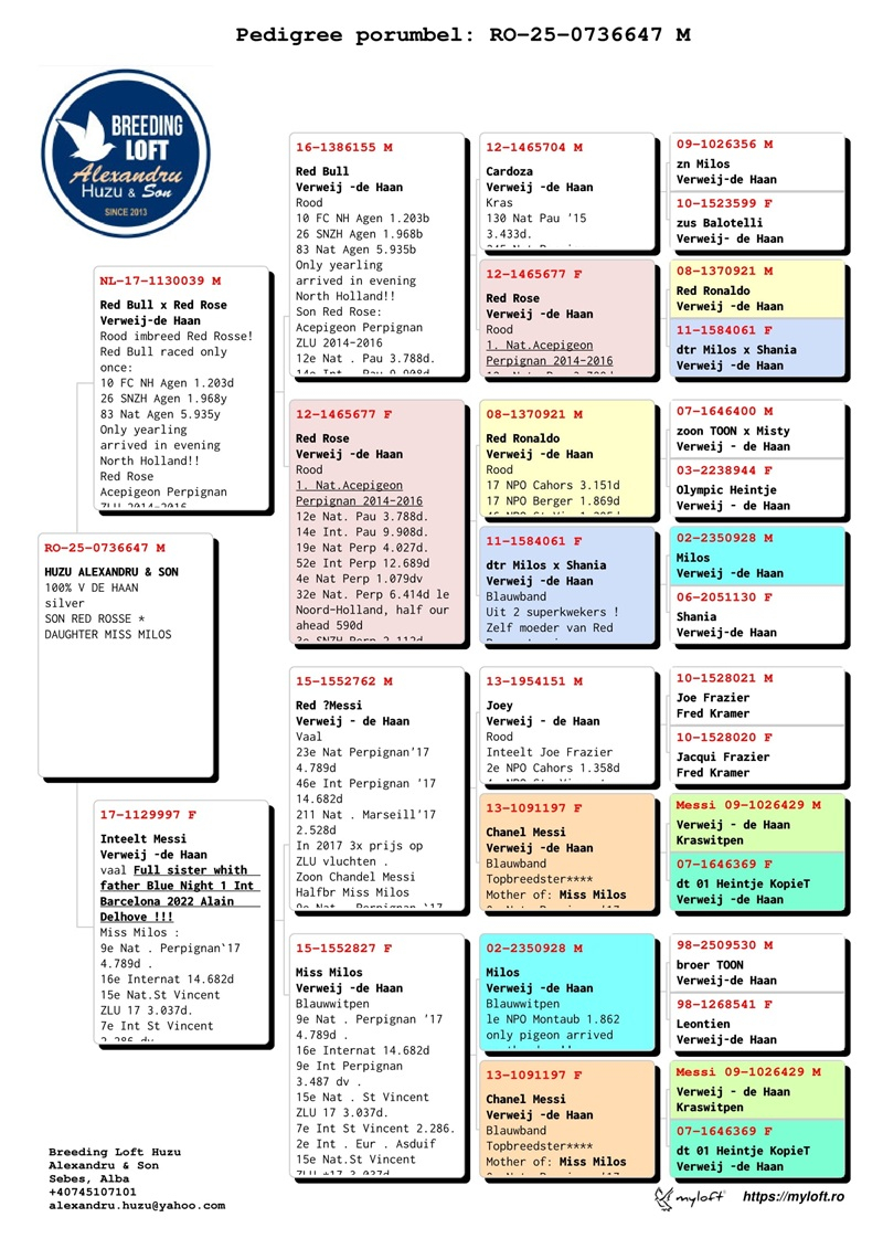 Alexandru Huzu hat es durch außergewöhnliche Anstrengungen und strenge Selektionsstrategien geschafft, seine Zuchtanlage zu einer der wertvollsten in Osteuropa zu machen. Er hat in Importe von den angesehensten Taubenzüchtern der Welt investiert, die sich auf verschiedene Kategorien wie Geschwindigkeit, Mittelstrecke, Langstrecke und Marathon spezialisiert haben. Zu diesen Züchtern gehören Jelle Jellema, Gaby Vandenabeele, die Familie Herbots, Pieter Veenstra, Jan Hoymans, Hans Eijerkamp, Dr. Brokamp, Anton und Luci van der Wegen, Ko van Domelen, Nouwen Paesen und viele andere.