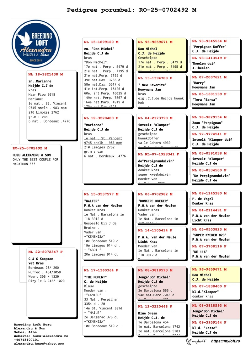 Alexandru Huzu hat es durch außergewöhnliche Anstrengungen und strenge Selektionsstrategien geschafft, seine Zuchtanlage zu einer der wertvollsten in Osteuropa zu machen. Er hat in Importe von den angesehensten Taubenzüchtern der Welt investiert, die sich auf verschiedene Kategorien wie Geschwindigkeit, Mittelstrecke, Langstrecke und Marathon spezialisiert haben. Zu diesen Züchtern gehören Jelle Jellema, Gaby Vandenabeele, die Familie Herbots, Pieter Veenstra, Jan Hoymans, Hans Eijerkamp, Dr. Brokamp, Anton und Luci van der Wegen, Ko van Domelen, Nouwen Paesen und viele andere.