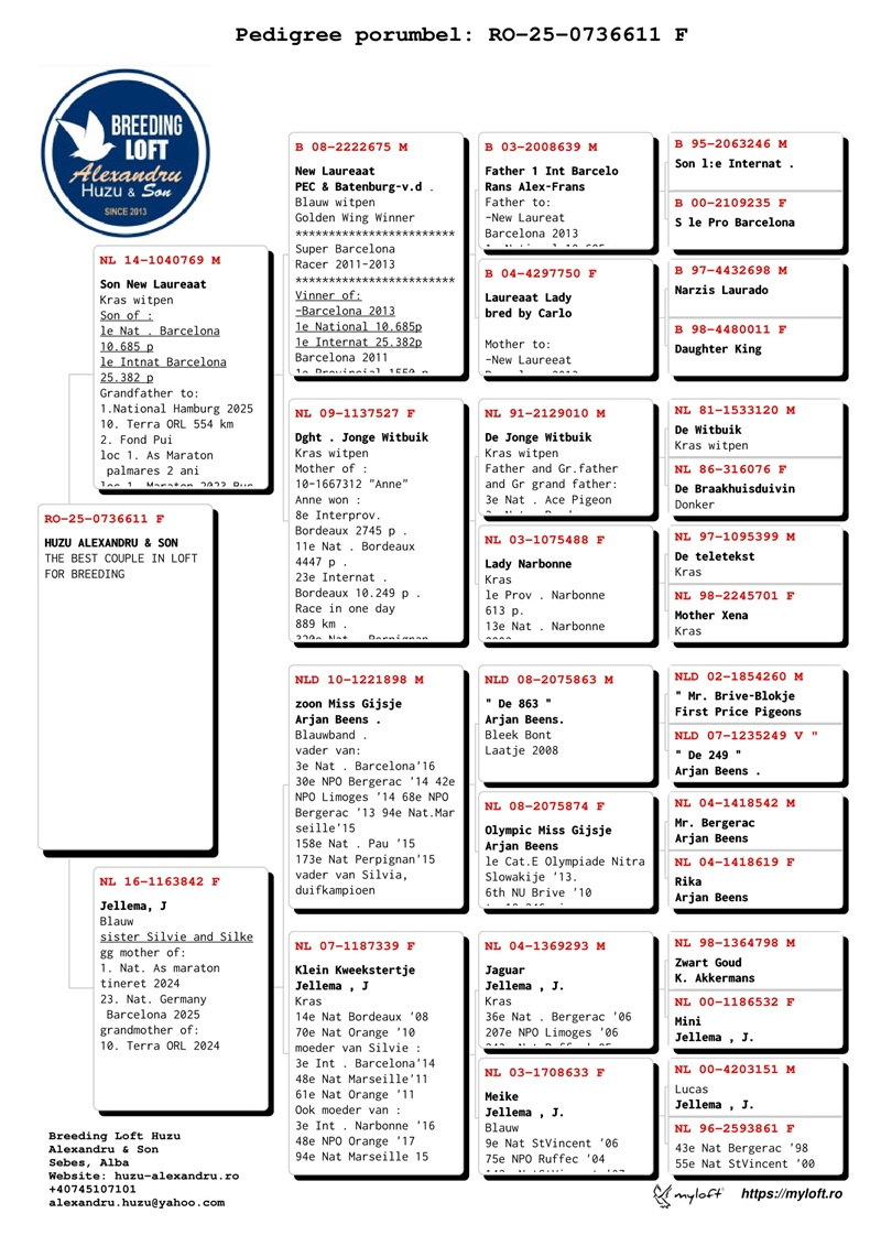 Alexandru Huzu hat es durch außergewöhnliche Anstrengungen und strenge Selektionsstrategien geschafft, seine Zuchtanlage zu einer der wertvollsten in Osteuropa zu machen. Er hat in Importe von den angesehensten Taubenzüchtern der Welt investiert, die sich auf verschiedene Kategorien wie Geschwindigkeit, Mittelstrecke, Langstrecke und Marathon spezialisiert haben. Zu diesen Züchtern gehören Jelle Jellema, Gaby Vandenabeele, die Familie Herbots, Pieter Veenstra, Jan Hoymans, Hans Eijerkamp, Dr. Brokamp, Anton und Luci van der Wegen, Ko van Domelen, Nouwen Paesen und viele andere.