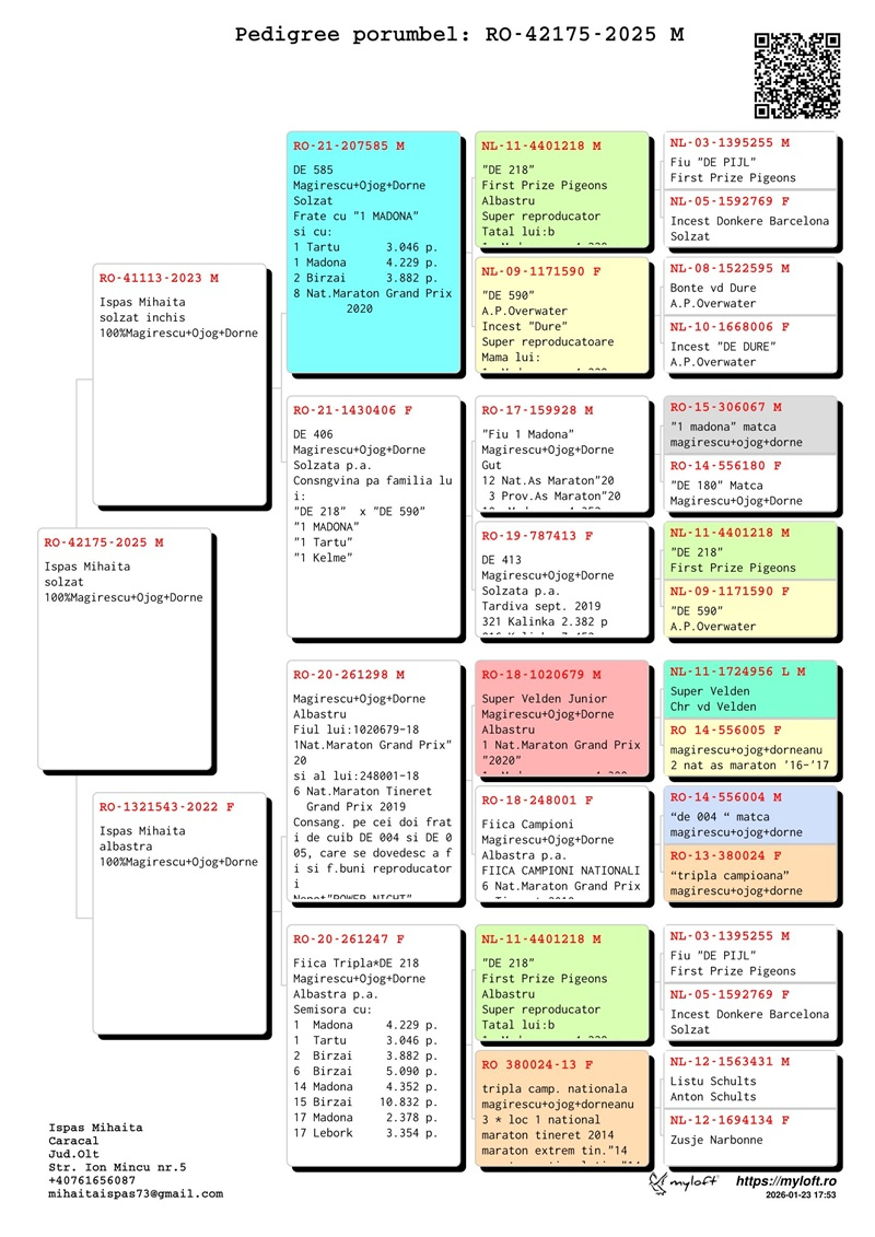 Der Protagonist dieses Erfolgs ist Ispas Mihăiță, ein in der Region bekannter Züchter, der bereits in der Vergangenheit in Langstreckenwettbewerben überzeugte. Er konzentrierte sich ausschließlich auf extreme Langstreckenrennen und verstand von Anfang an, dass der Schlüssel zum Erfolg in der Qualität der Tauben liegt. Auf der Suche nach Spitzenleistung studierte er die Arbeit führender Züchter in Rumänien und arbeitete mit ihnen zusammen. In seiner Zuchtabteilung finden sich nun Tauben des berühmten Trios Magirescu-Ojoc-Dorneanu sowie von Züchtern wie Cioacă Florin und Preda Gheorghe. Diese Strategie erwies sich als Schlüssel zum Erfolg, der mit dem Gewinn des 1. Platzes in der Nationalen As Maraton Tineret gekrönt wurde.