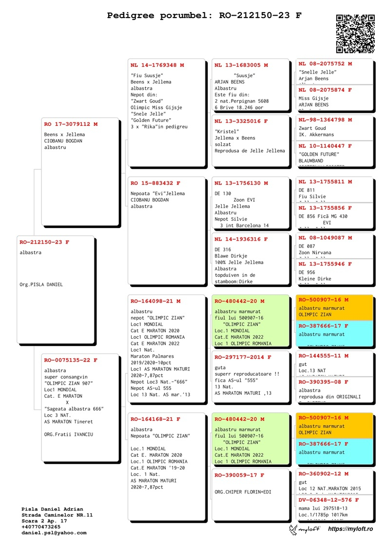 Im Rahmen dieser Auktion bietet Pîslă Daniel eine exklusive Kollektion von Tauben an, die direkt aus der Nachzucht seiner erfolgreichsten Champions stammen. Diese wertvollen Exemplare repräsentieren das genetische Erbe der prestigeträchtigsten Gewinner, die ihm im Laufe der Jahre Ruhm eingebracht haben, und machen ihn zu einem wahren „Trophäensammler“. Die Teilnahme an dieser Auktion bietet eine seltene Gelegenheit, außergewöhnliche Tauben mit beeindruckendem Stammbaum zu erwerben, die das unverkennbare Zeichen von Pîslă Daniels Meisterschaft und Vision tragen.
