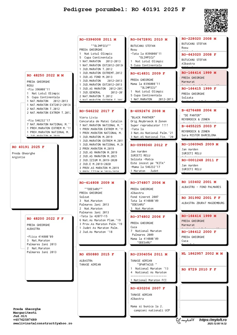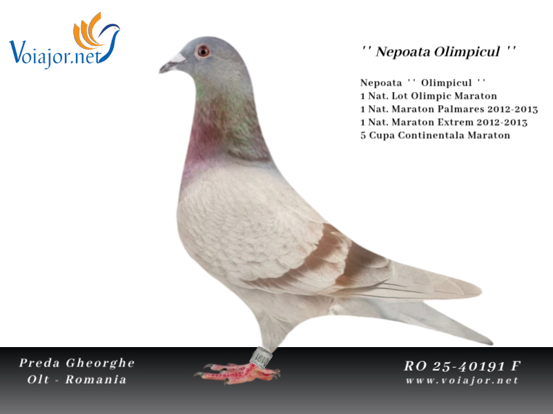 Zwischen 2000 und 2011 erzielte Gheorghe Preda bemerkenswerte Ergebnisse auf Kreisebene und nationaler Ebene. Ab der Saison 2012 erzielte er jedoch außergewöhnliche Ergebnisse auf nationaler Ebene, trotz der kleinen Anzahl an teilnehmenden Tauben. In jener Saison startete er mit einem Team von 24 Tauben, von denen 13 die Norm in der Marathon-Kategorie und 12 in der As-Marathon-Kategorie erfüllten, darunter 10 Jahrlinge und eine späte Taube, sowie 2 ausgewachsene Tauben.
