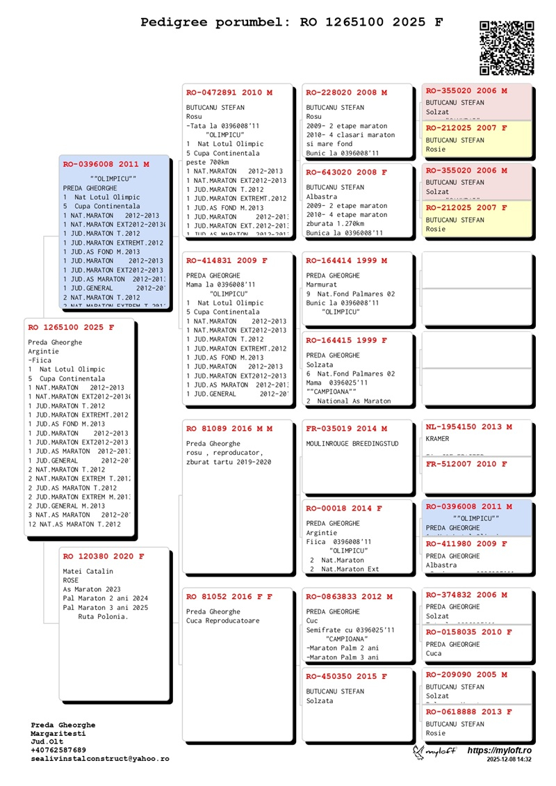 Zwischen 2000 und 2011 erzielte Gheorghe Preda bemerkenswerte Ergebnisse auf Kreisebene und nationaler Ebene. Ab der Saison 2012 erzielte er jedoch außergewöhnliche Ergebnisse auf nationaler Ebene, trotz der kleinen Anzahl an teilnehmenden Tauben. In jener Saison startete er mit einem Team von 24 Tauben, von denen 13 die Norm in der Marathon-Kategorie und 12 in der As-Marathon-Kategorie erfüllten, darunter 10 Jahrlinge und eine späte Taube, sowie 2 ausgewachsene Tauben.