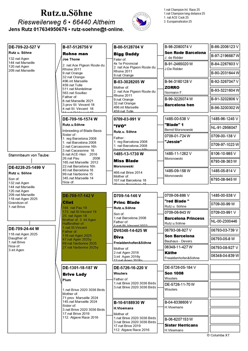 Die Zwillinge Jens und Sven Rutz haben erfolgreich die Staffel von ihrem Vater Karl-Heinz Rutz übernommen und führen die Tradition der Spitzenleistungen auf höchstem Niveau fort. Unter ihrer Führung erzielte die Familie Ergebnisse, die die Erwartungen vieler Züchter übertreffen, und wird von Fachleuten als einer der stärksten Konkurrenten Deutschlands angesehen. Professionalität, Disziplin und bedingungslose Leidenschaft für Brieftauben haben den Status der Familie Rutz in der Elite des europäischen Brieftaubensports gefestigt.